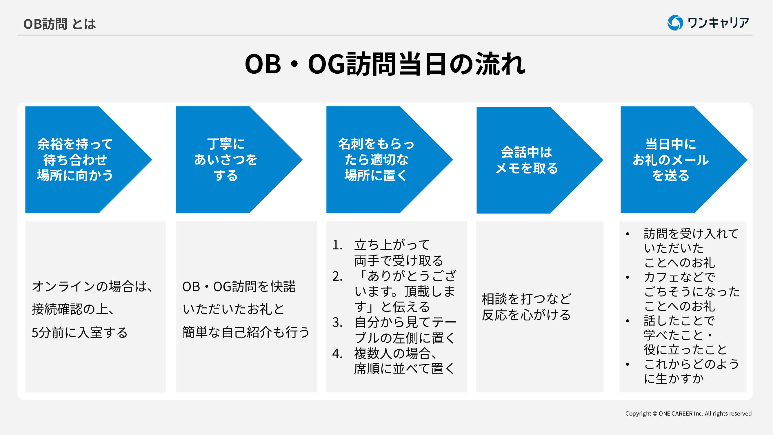 <目次> ●OB・OG訪問とは? ●OB・OG訪問はいつから始める? ●OB・OG訪問のメリット ・社員の生の声を聞ける ・選考対策になる ●OB・OG訪問のやり方|OBを探す方法 ・大学の先輩に頼む ・大学のキャリアセンターを利用する ・企業説明会や就活イベントで出会った社員に頼む ・企業の人事に直接連絡する ・逆求人サイトのメッセージで頼む ・OB・OG訪問用のウェブサイト・アプリを使う ・SNSでOB・OG訪問の相手を探す ●OB・OG訪問のやり方|事前準備編 ・日程調整してアポイントをとる ・OB・OGの所属やバックグラウンドを事前チェックする ・企業分析を入念に行い、踏み込んだ質問を考える ・質問リストを事前に送付する ・リマインドメールを送る ●OB・OG訪問のやり方|当日編 ・【対面時】余裕を持って待ち合わせ場所に向かう ・【オンライン時】接続確認のうえ、5分前には入室する ・丁寧にあいさつをする ・名刺をもらったら適切な場所に置く ・会話中はメモを取る ・相槌を打つなど反応を心がける ・当日中にお礼のメールを送る ●OB・OG訪問に関するよくある疑問点 ・OB・OG訪問時の服装は? ・OB・OG訪問はどこで実施する? ・OB・OG訪問の長さはどのくらい? ●OB・OG訪問ができない人向け:人気の「凸ゲキ!代わりにOBOG訪問!」一覧 ●まとめ