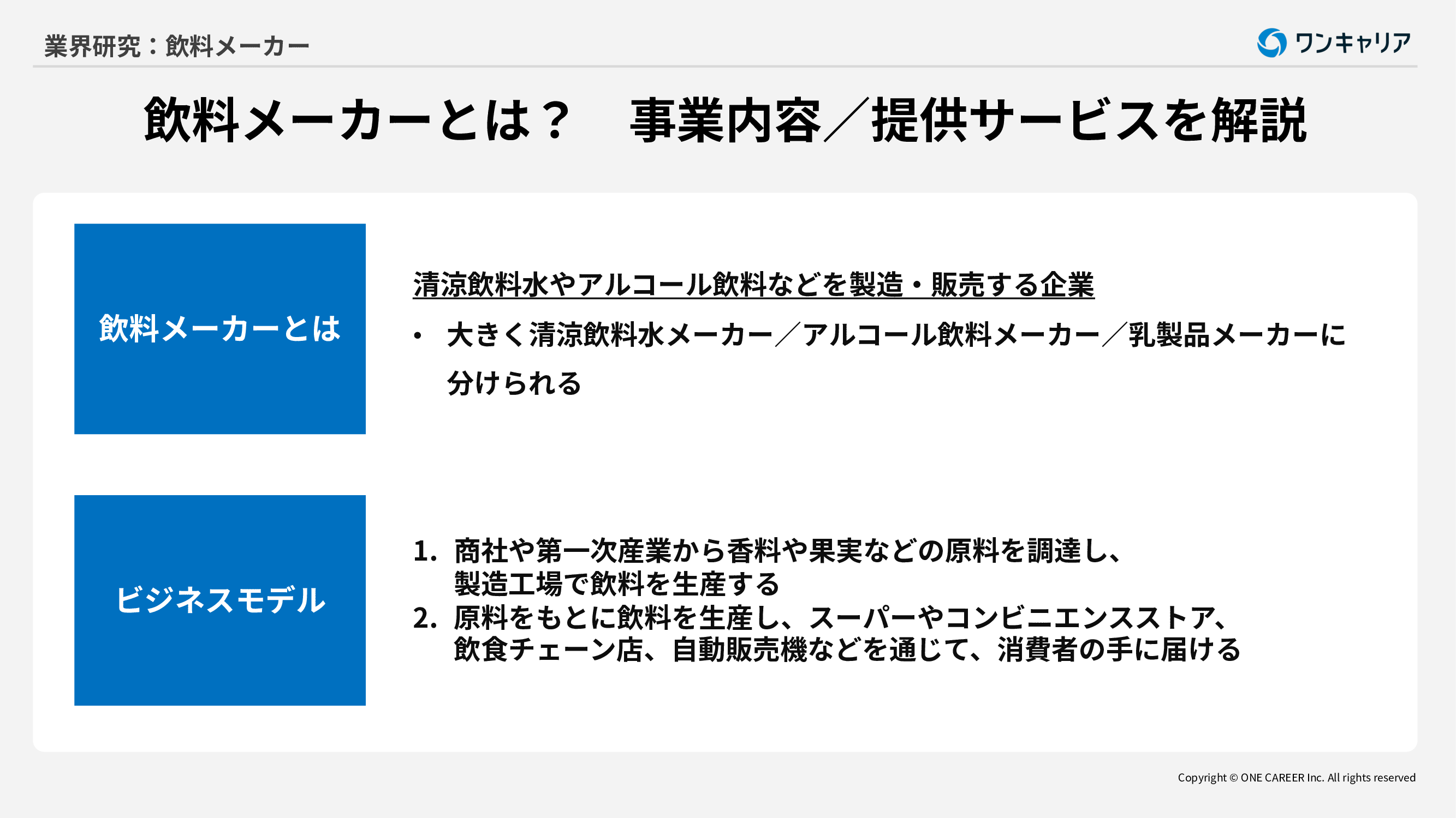 <目次> ●飲料メーカーとは? 事業内容/提供サービスを解説 ●飲料メーカーの業界動向 ・全体の動向 ・清涼飲料水メーカーの動向 ・アルコール飲料メーカーの動向 ・乳製品メーカーの動向 ●飲料メーカーの仕事内容・主な職種 ・研究開発職 ・企画・マーケティング ・調達・購買 ・生産管理 ・品質保証 ・営業職 ●飲料メーカー業界大手4社の業績比較・ランキング(売上収益/営業利益/営業利益率) ●飲料メーカー業界大手4社の特徴・強み ・アサヒ:トレンドに合わせた商品展開と積極的な海外展開 ・キリン:事業の多角化を目指す。医薬事業への挑戦も ・サントリー:幅広い商品ブランド、積極的なM&Aで海外展開を図る ・サッポロ:不動産事業への挑戦 ●飲料メーカー業界大手4社の社風の違い・制度 ・アサヒ:チームで業務に取り組む、熱意と信頼関係に満ちた職場環境 ・キリン:真面目で誠実な人が多く、チームワークを重視する社風 ・サントリー:「やってみなはれ」を体現した、個人主義・能力主義の社風 ・サッポロ:オンリーワンを目指し、チャレンジ精神と巻き込み力がある人材に適した社風 ・飲料メーカー選考の共通のポイント:深い企業理解の伴った明確な志望動機 ●飲料メーカー業界大手4社の平均年収・平均年齢・平均勤続年数 ●飲料メーカーで働く魅力・やりがい ・人々の暮らしを支えている実感が得られる ・チームでの達成感を得られる ●飲料メーカー業界大手4社の選び方 ・自己分析で自分の強みや価値観を洗い出そう! ・情報収集ではONE CAREERの【選考対策ページ】を有効活用しよう! ・ワンキャリア公式YouTubeチャンネル『【公式】ワンキャリアライブ』を活用しよう! ・手間がかかる「業界研究」はONE CAREERにおまかせ! ・企業研究を効率よく進めたい方には「合格の秘訣」がおすすめ! ・就活の軸を見つけ、自分の価値観を整理しよう ●飲料メーカー業界大手4社が求める人物像・選考対策 ・飲料メーカーが求める人物像 ・飲料メーカーの選考対策 ●飲料メーカー以外の業界研究記事