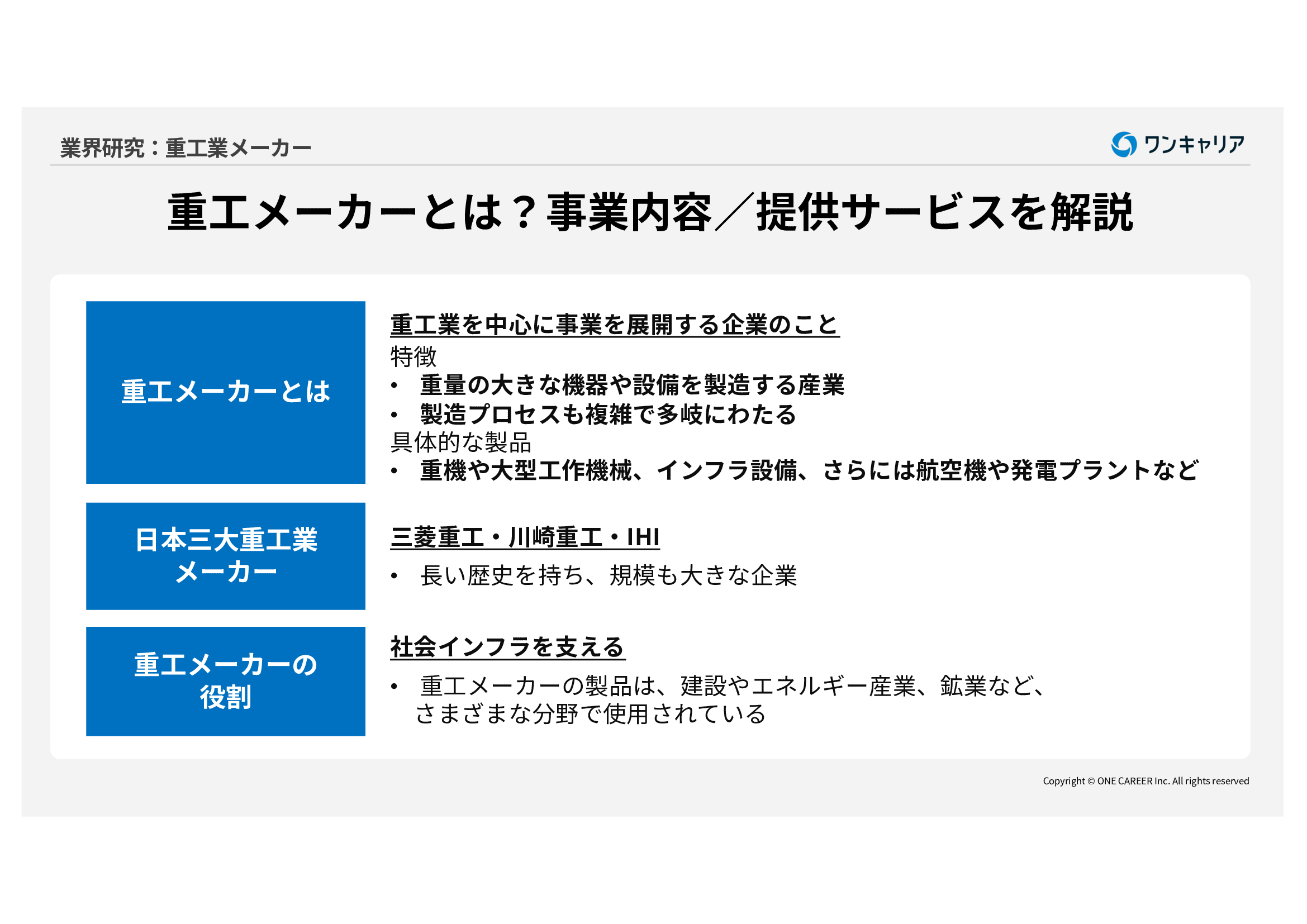 <目次> ●重工メーカーとは? 事業内容/提供サービスを解説 ●重工メーカーの業界動向 ・全体の動向 ・鉄道車両・船舶・航空部品業界の動向 ・発電所業界の動向 ・ロボット業界の動向 ・防衛設備業界の動向 ・宇宙産業関連業界の動向 ●重工メーカーの仕事内容・主な職種 ・研究開発職 ・設計職 ・製造職 ・生産技術・管理職 ・資材調達職 ・品質管理職 ・現地建設職 ・営業職 ●重工メーカー業界大手5社の業績比較・ランキング(売上高/営業利益/営業利益率) ●重工メーカー業界大手5社の特徴・強み ・三菱重工業:日本を根底から支える業界最大手 ・川崎重工業:陸や海、宇宙まで。多彩な製品を送り出す ・IHI:海外からの高い評価 ・住友重機械工業:精密機器からプラントまで幅広く支える技術力 ・三井E&S:海洋・エネルギー分野で培った造船やエンジンに強い ●重工メーカー業界大手5社の社風の違い・制度 ・三菱重工業:社会貢献への意欲が高い社員が多く、若手から海外で働ける可能性も ・川崎重工業:穏やかな社員が多く、のびのびと働ける環境 ・IHI:人材こそが最大かつ唯一の財産であるという理念 ・住友重機械工業:挑戦を後押しする風土と、穏やかで協力的な社風 ・三井E&S:造船の伝統を受け継ぎつつ、新事業に挑む柔軟な文化 ●重工メーカー業界大手5社の平均年収・平均年齢・平均勤続年数 ●重工メーカーで働く魅力・やりがい ・スケールの大きい仕事に携われる ・福利厚生が手厚いところが多い ●重工メーカー業界大手5社の選び方 ・自己分析で自分の強みや価値観を洗い出そう! ・情報収集ではワンキャリアの【選考対策ページ】を有効活用しよう! ・ワンキャリア公式YouTubeチャンネル『【公式】ワンキャリアライブ』を活用しよう! ・手間がかかる「業界研究」はワンキャリアにおまかせ! ・企業研究を効率よく進めたい方には「合格の秘訣」がおすすめ! ・就活の軸を見つけ、自分の価値観を整理しよう ●重工メーカー業界大手5社が求める人物像・選考対策 ・重工メーカーが求める人物像 ・重工メーカーの選考対策