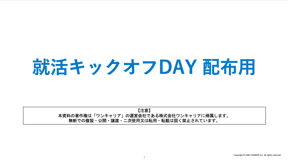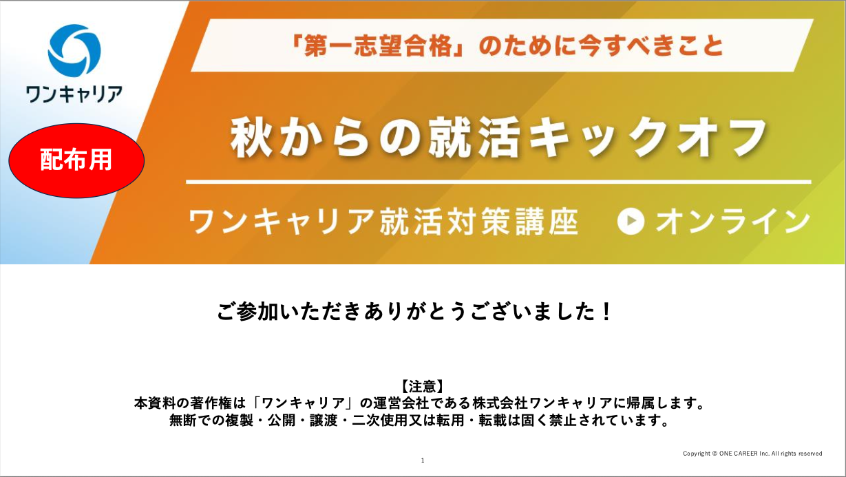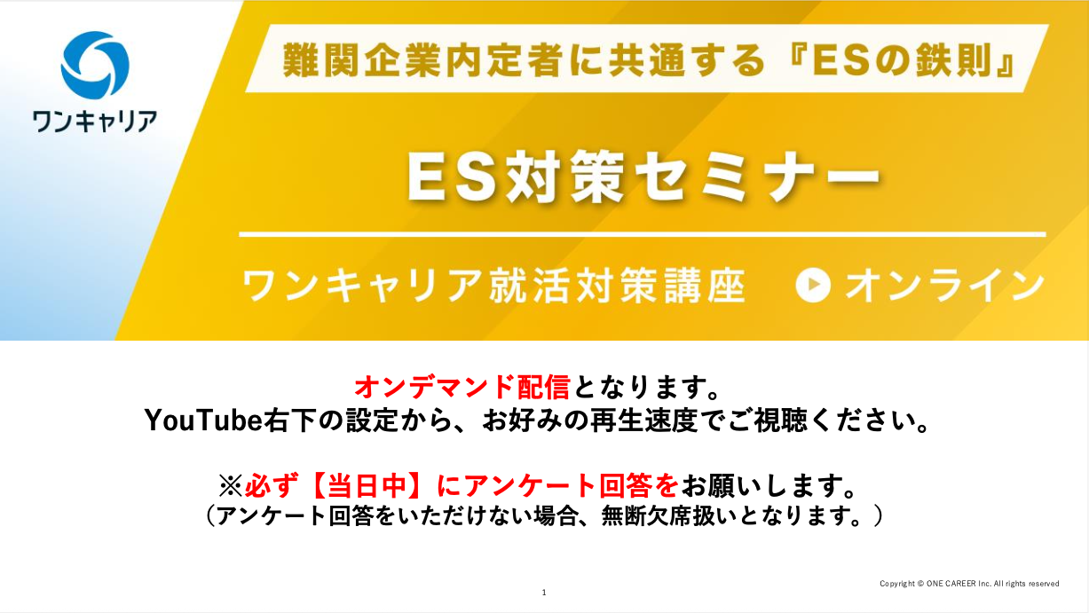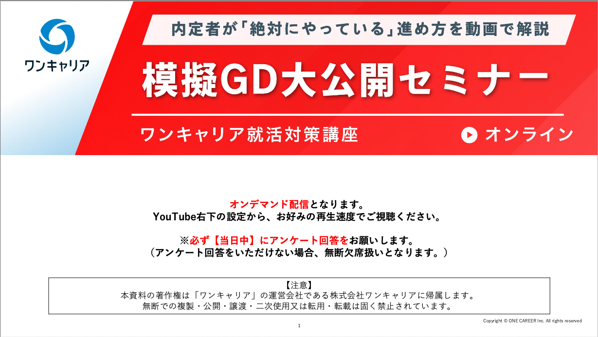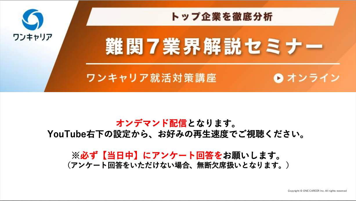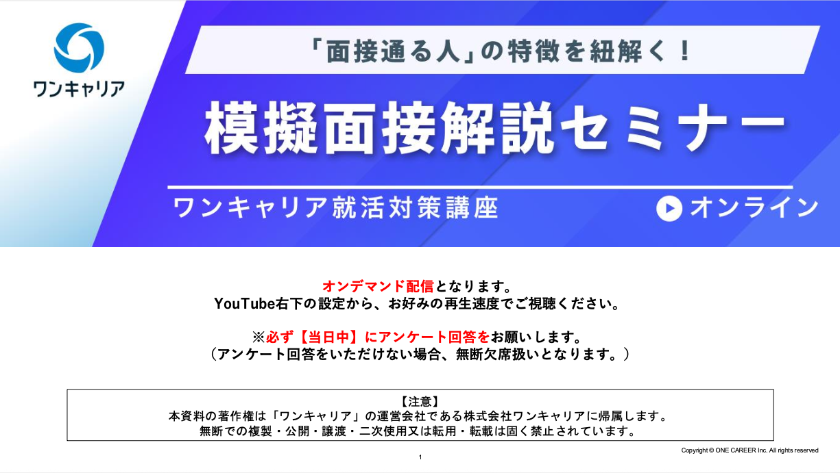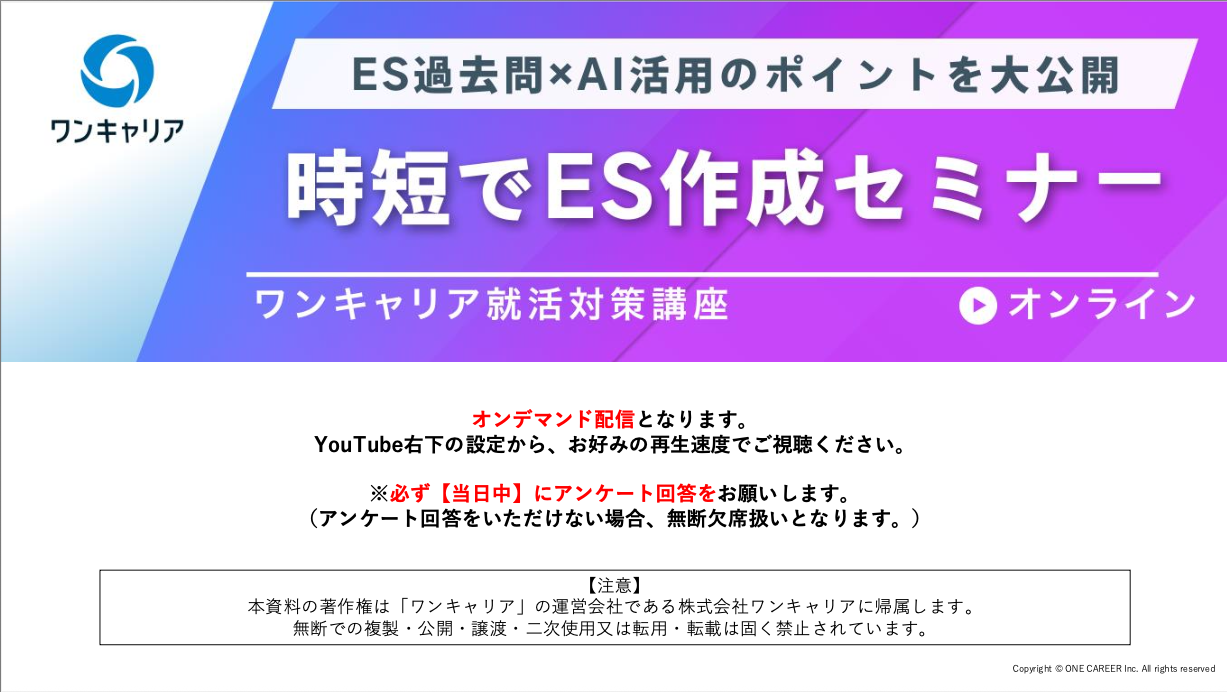 ※ 本資料の著作権は「ONE CAREER」の運営会社である株式会社ワンキャリアに帰属します。 無断での複製・公開・譲渡・二次使用又は転用・転載は固く禁止されています。ご注意ください!