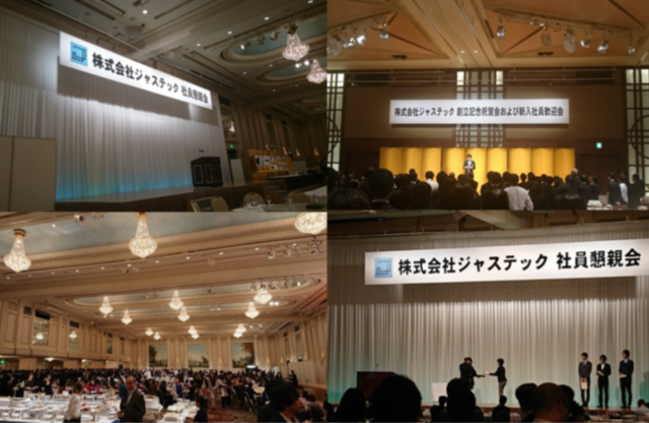 これらのイベントはホテルのホールで開催されます。普段は別のオフィスで働く社員が一同の集まり、社員同士の交流の場となっています。
