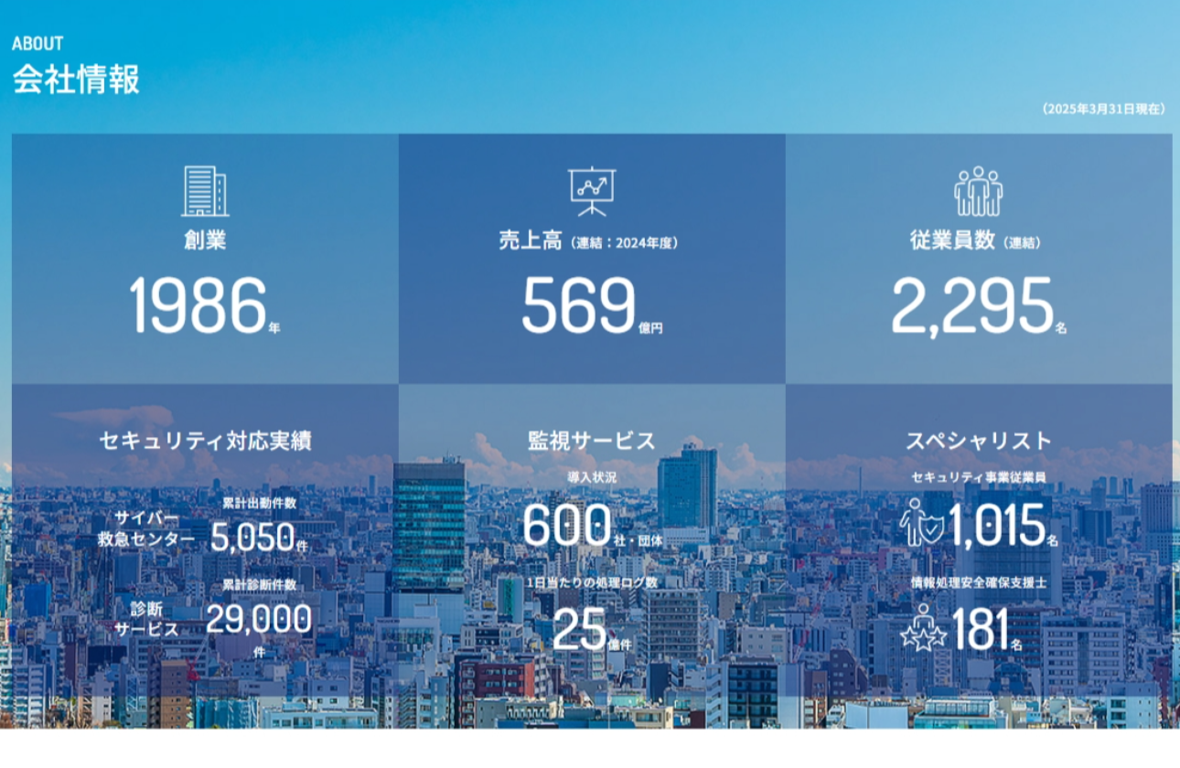 緊急対応件数は5,000件超。AIとRPAによる自動診断サービス「DiaForce」が全診断の20%以上を占め、情報処理安全確保支援士181名、セキュリティ専門家1015名が在籍することから、業界内での信頼と技術力の高さが際立ちます。