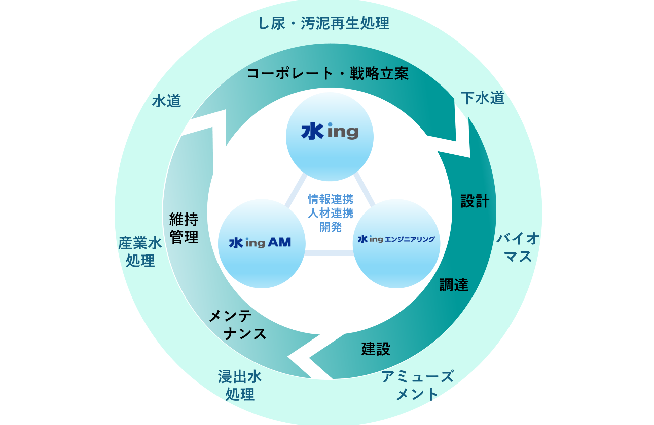 水ing(すいんぐ)は、事業系計画、設計・建設、運営管理やメンテナンス、さらには高度な水処理技術の研究開発まで、一貫したサービスを提供します。