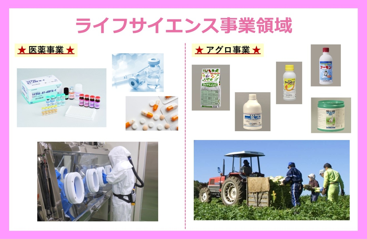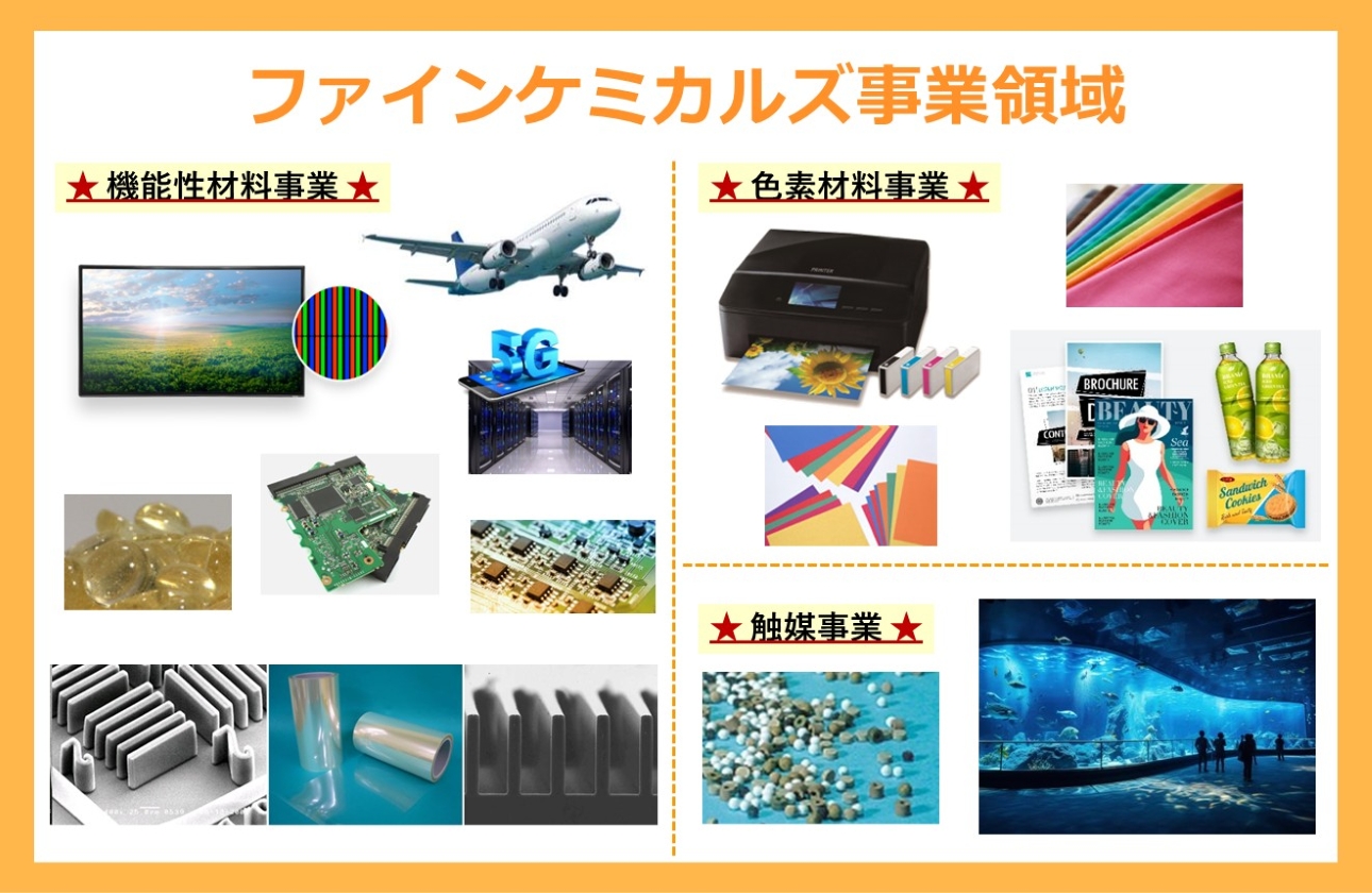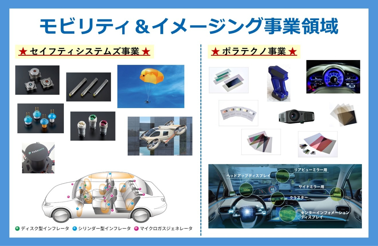 現在、「モビリティ」「エレクトロニクス」「ライフサイエンス」「環境・エネルギー」を成長分野として照準を定め、自動車安全部品、機能性材料、色素材料、触媒、医薬、農薬と多岐にわたる事業を展開しています。これらは当社基盤技術である「火薬技術」「染料技術」「医薬技術」「樹脂技術」を土台に、さまざまな技術を融合させて築き上げてきた事業です。