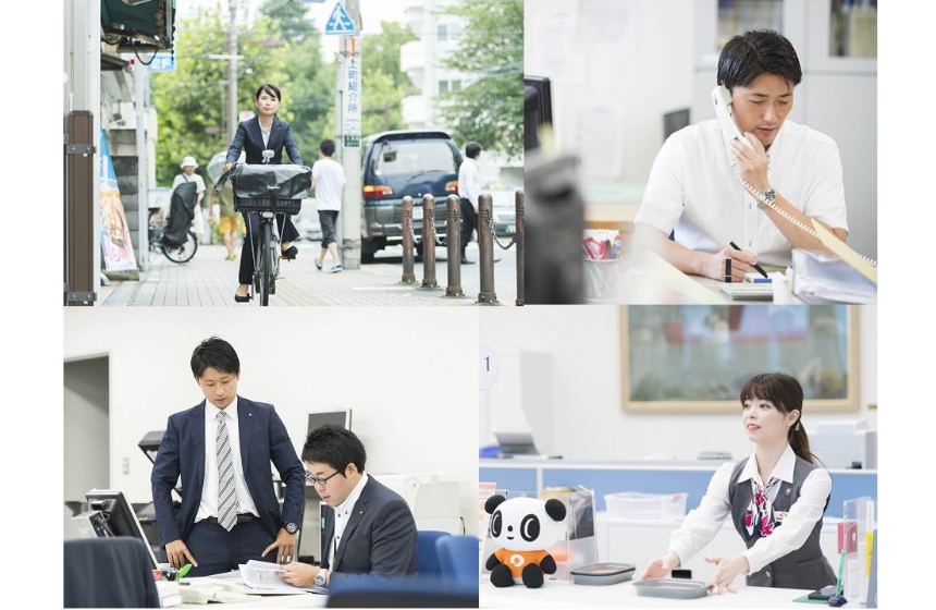 自転車で移動し、担当する地区内の法人・個人問わず訪問、お客さまのニーズに合わせたサービスを提供する。特に企業の資金繰りを把握し、最適な融資提案を行うだけでなく、お客さまの本業を支援する「課題解決型の営業スタイル」が中心です。企業と人を支える魅力的な仕事と言えるでしょう。