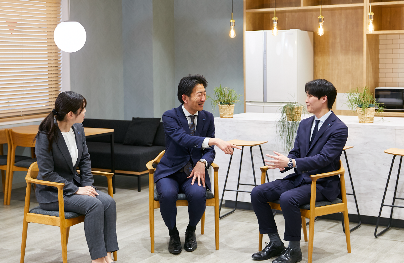 また、年次や立場に関係なく互いにフォローし合い、成功事例や課題を共有しながら切磋琢磨できる風土が根付いています。個人プレーではなく、仲間と高め合いながら大きなプロジェクトを動かすやりがいが、あなぶき興産の営業スタイルの魅力です。