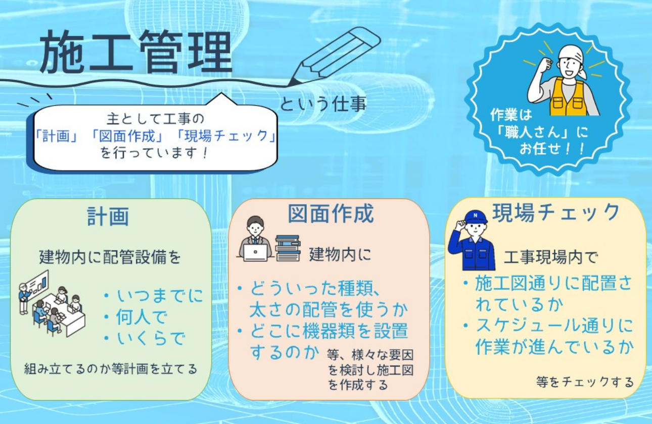 主に給排水衛生設備工事における 品質・工程・安全・予算管理 を担当します。