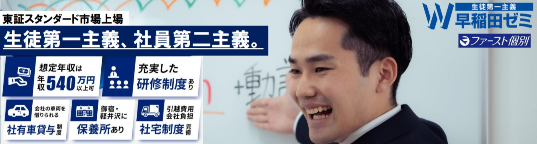 集団学習塾「W早稲田ゼミ」と個別指導塾「ファースト個別」の2種類のブランドで学習塾を展開している当社は、東京・埼玉・群馬・栃木に約60拠点を運営。W早稲田ゼミでは、「授業は全員正社員教師」という体制で質の高い授業を提供。生徒や保護者様に圧倒的な信頼を得ながら、急速に事業を拡大。2023年12月には、東証スタンダード市場へ上場を果たし、成長を続けています。今後は新校舎の設置に伴い、塾長などの責任あるポジションが増えるため、優秀な人材の参加を広く求めています。20代でもやる気と能力次第で、マネジメントレベルで活躍できるチャンスがたくさんあります。私たちと一緒に、生徒たちの成長を担う仕事をしてみませんか。