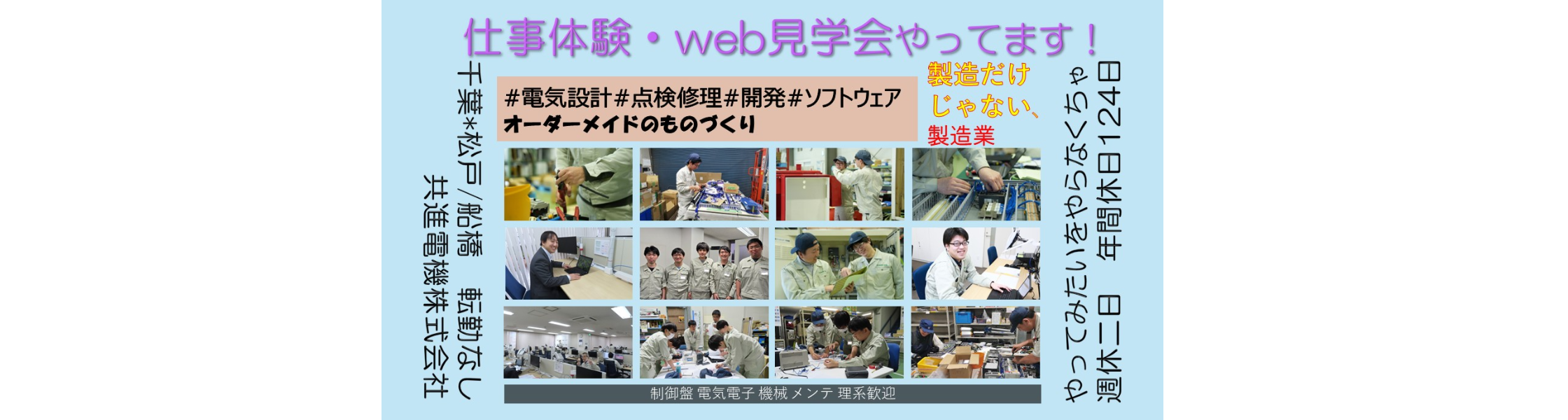 自動車や食品工場のベルトコンベアやアームロボットを自在に動かす装置を設計、製造、試運転するのが得意です!