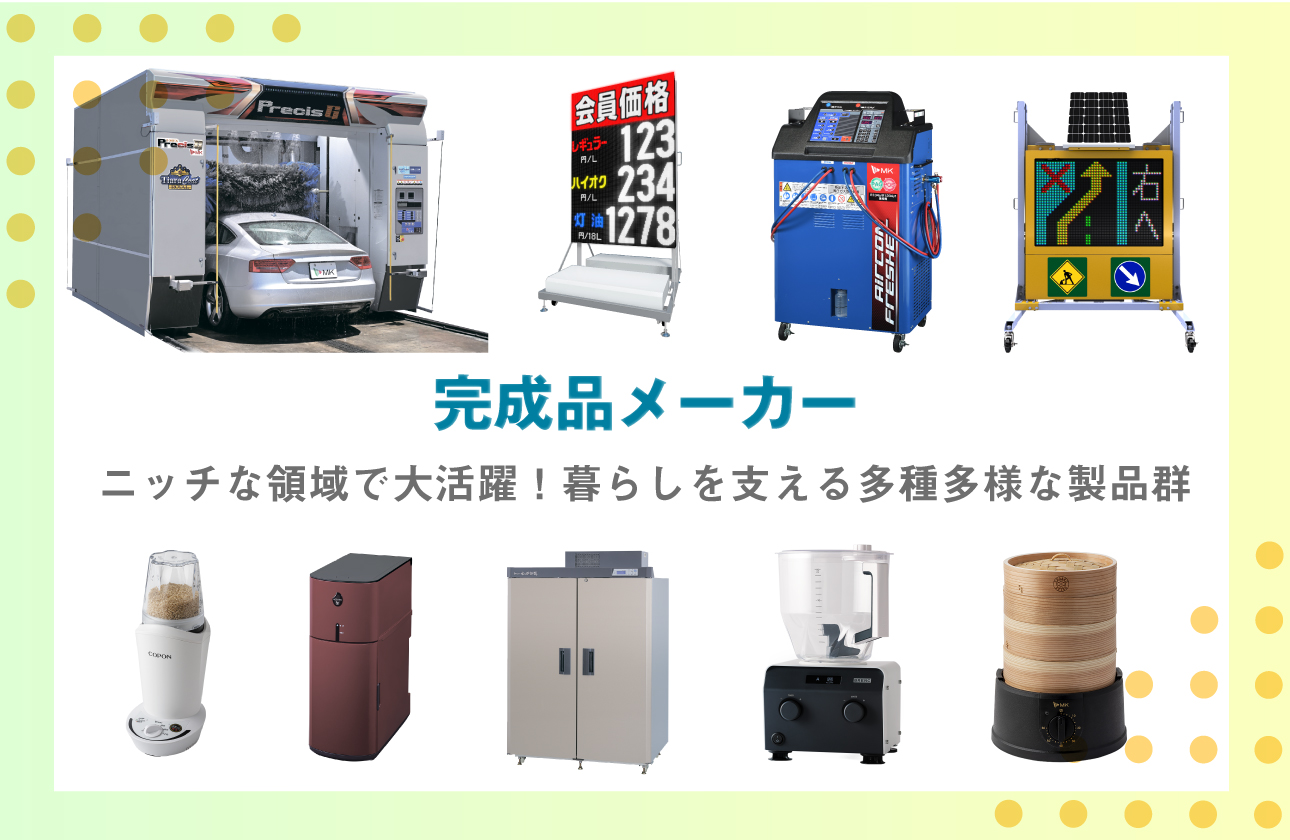 洗車機やホームベーカリーといった生活に身近なモノ。黒にんにくメーカーや小型精米機のようなニッチなモノ。そして道路標識や工事用LEDなど街角で活躍しているモノ。