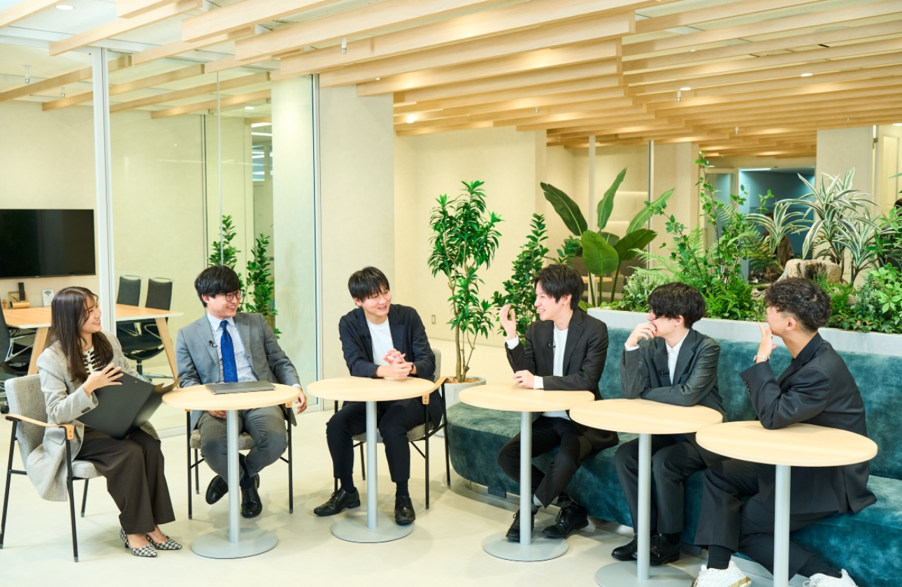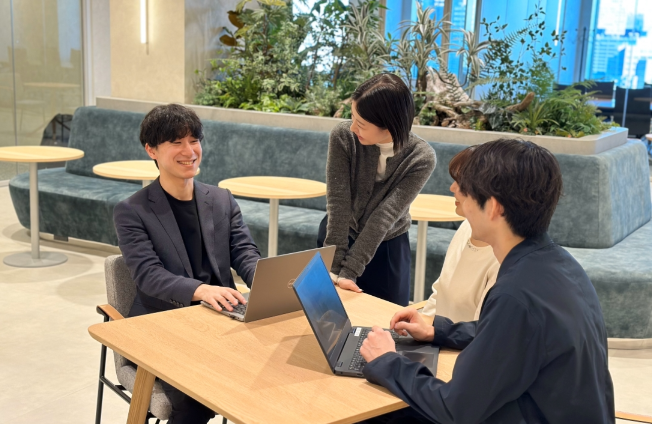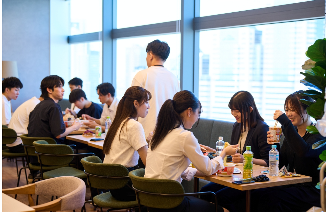 社員同士がテーブルを囲み、会話をしながらリラックスした時間を過ごしています。窓からは都会の景色が広がり、働きやすい環境を提供しています。
