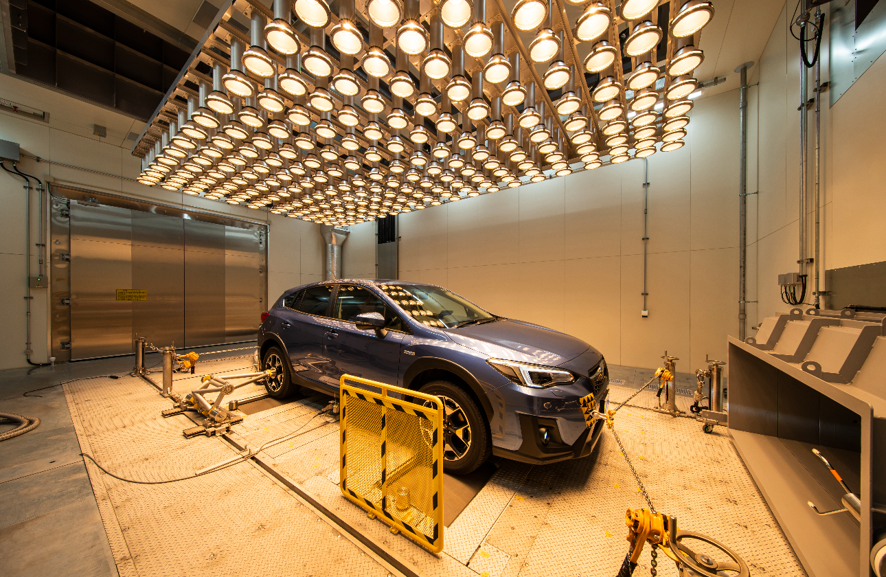 車両の動力性能や排ガス性能、商品性能を評価するための試験装置です。 軽自動車から普通乗用車の評価することが出来ます。 実走行状態を模擬するために、風洞型車風速ファン(開口幅2000mm、高さ1000mm) を装備し、低温環境(-30度)から高温環境(50度)まで様々なシチュエーションを再現します。