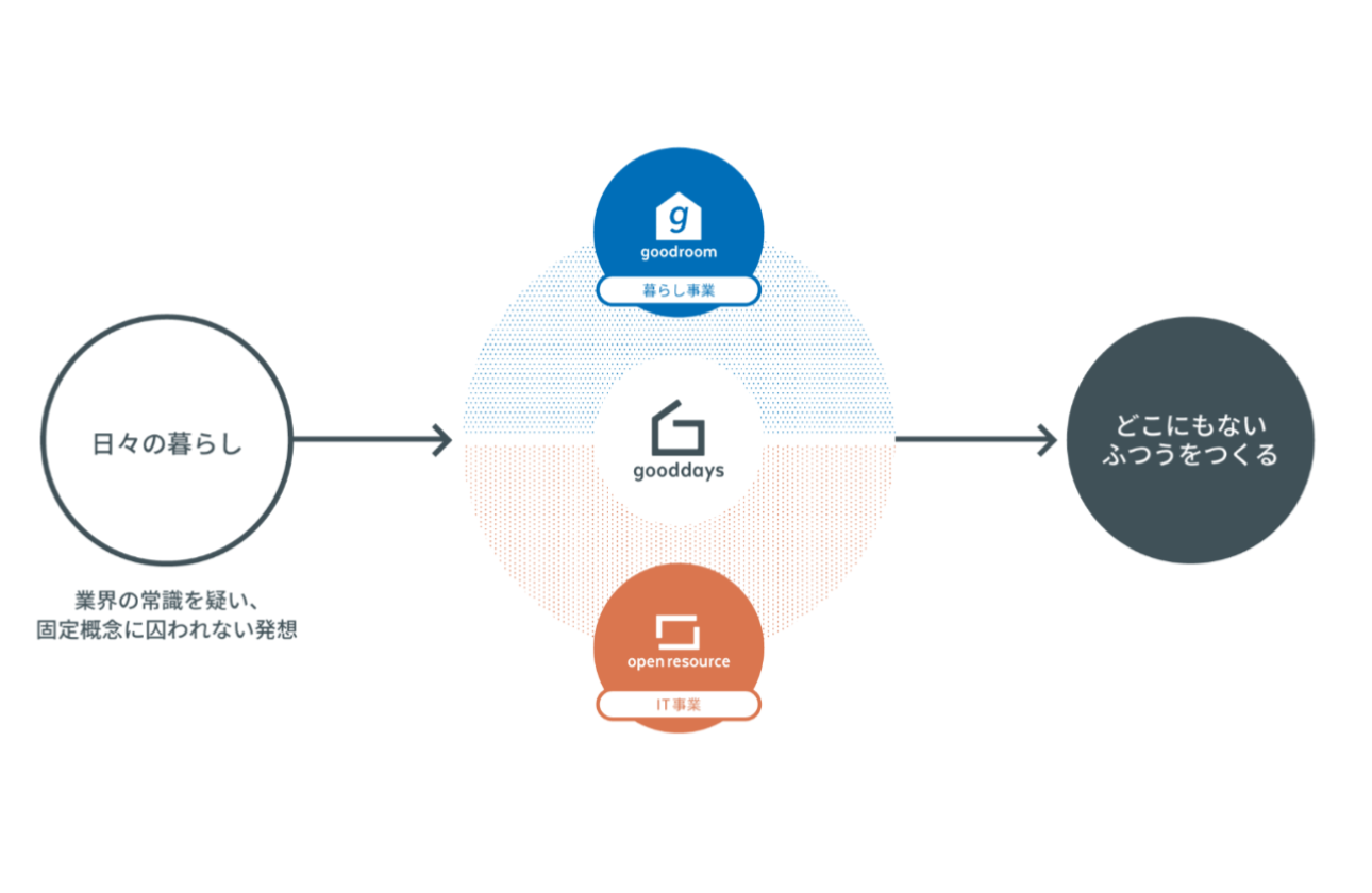gooddaysホールディングスは、ITビジネスを展開するオープンリソースと、くらしのビジネスを展開するグッドルームの2社を事業子会社に持ち、「暮らし×IT」を軸にビジネスを展開しています。
