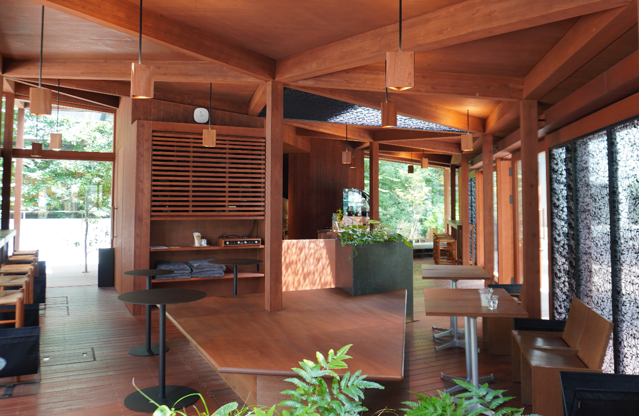 東陽町オフィスに併設する、自社運営のカフェ。木の温かみを感じる空間で、仕事の合間にリラックス。
