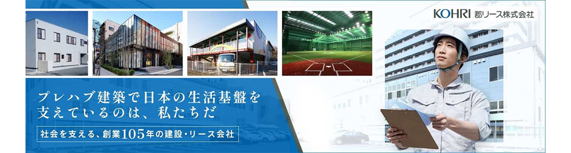 郡リースはプレハブ建築をメインに事業を展開するシステム建築メーカーです。プレハブというと工事現場の仮設事務所というイメージが強いかと思いますが、実はそれだけではありません。短工期・ローコストで高品質という特徴のあるプレハブ建築は、オフィス、工場、倉庫、店舗、学校、スポーツの練習場といった恒久的に使用する建物にも数多く採用されています。また、地震や豪雨などの災害時の応急仮設住宅、最近では新型コロナウイルス感染症対策による臨時の仮設病棟など、有事の際にも当社のプレハブ建築は社会に大きく貢献しています。