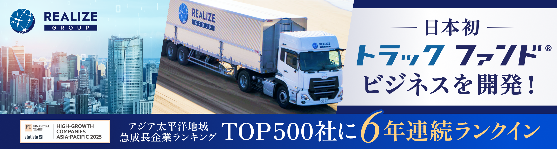 私たちリアライズコーポレーションは、「トラックファンド(R)」や「R.リース(R)」等を通じて、私たちの生活になくてはならない運送会社の支援、物流業界の活性化を目指すとともに、日本社会のより良い発展に貢献すべく、事業を展開しています!