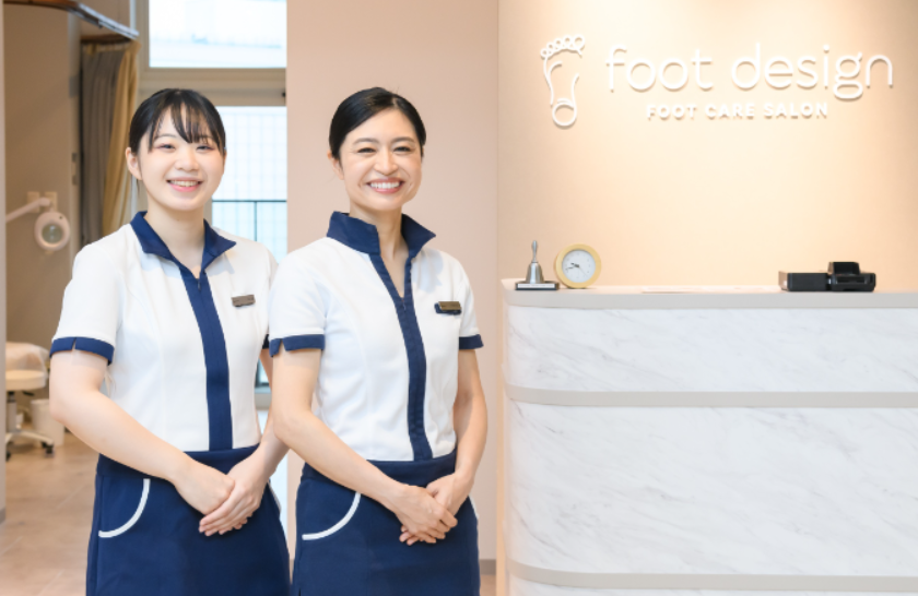 研修は体の部位の名称、骨格・しくみのレクチャーからはじまり、ボディケアとリフレクソロジーについて実践的に学習。受講生同士がペアを組んで施術の練習を重ね、施術される側=お客さまの立場もあわせて体験することで、お客さま目線に立ったセラピストを育成しています。そして、接客研修では、受付からお見送りまでの言葉遣いや振る舞いを学び、模擬カウンターを使って会計業務も含めたロールプレイングを重ねます。