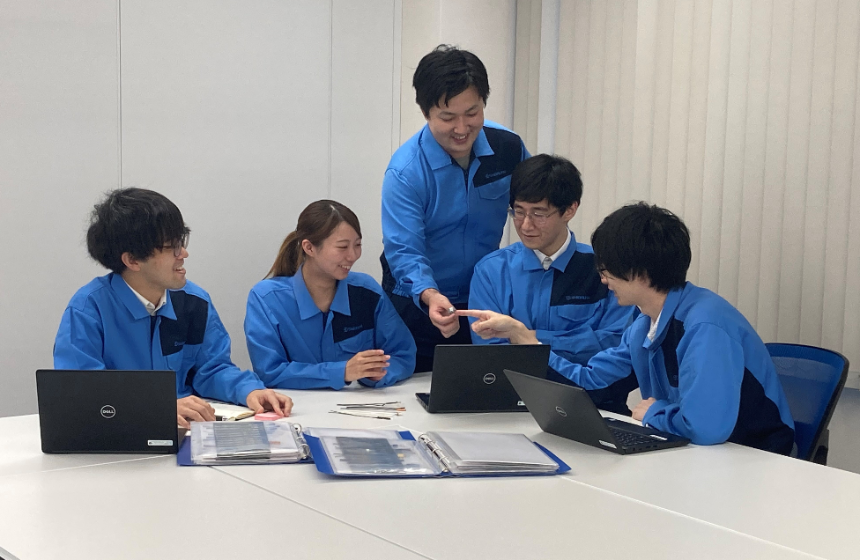 新入社員研修ではビジネスマナーや会社製品に関する基礎知識を習得します。同期同士の絆を結ぶ機会として、製造工場研修や外部機関による集合研修も行っております。