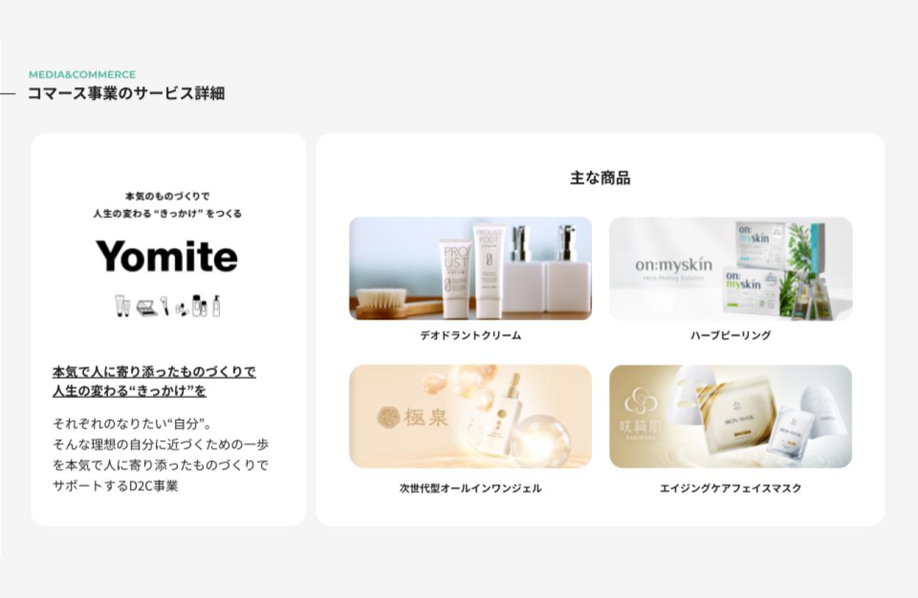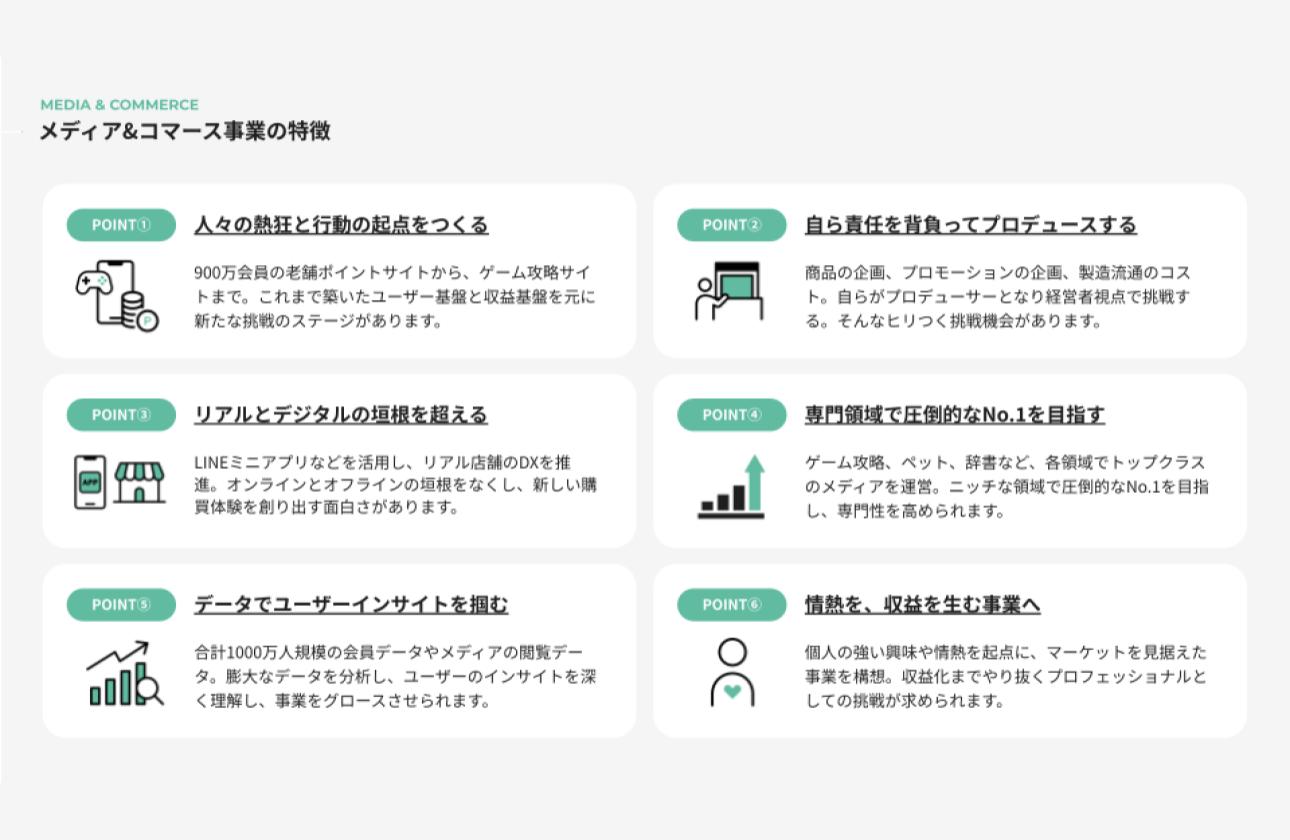 日本最大級のポイントサイトをはじめ、犬種特化型メディアやゲーム攻略メディアなどの「メディア事業」、ECを中心としたマーケティングや商品開発/販売などを行う「コマース事業」。これらを通じた情報提供に留まらず、「人と人」、「人と商品」に対して新たな出会いを創出し、より豊かな体験を提供することをミッションとしています。