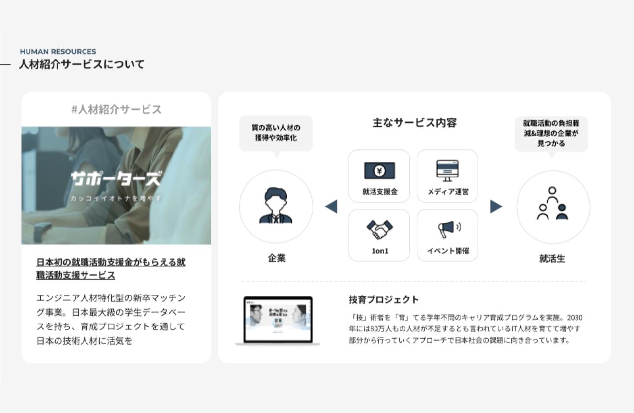 就職活動を進める度に支援金がもらえる日本初の学生向け就職活動支援サービスの展開や、デジタルマーケティング人材育成のための動画eラーニングサービスの展開など、活気あふれる人材を通したより良い社会の実現を目指しています。