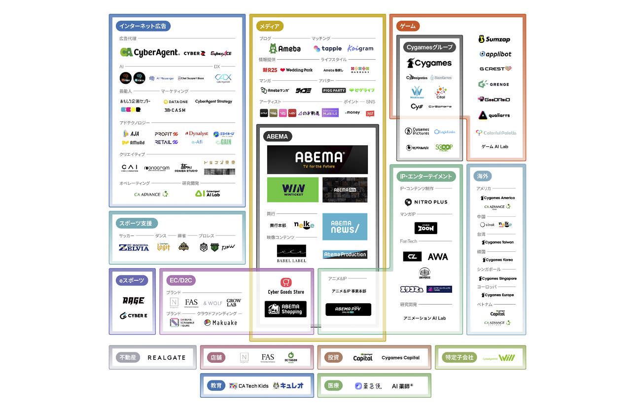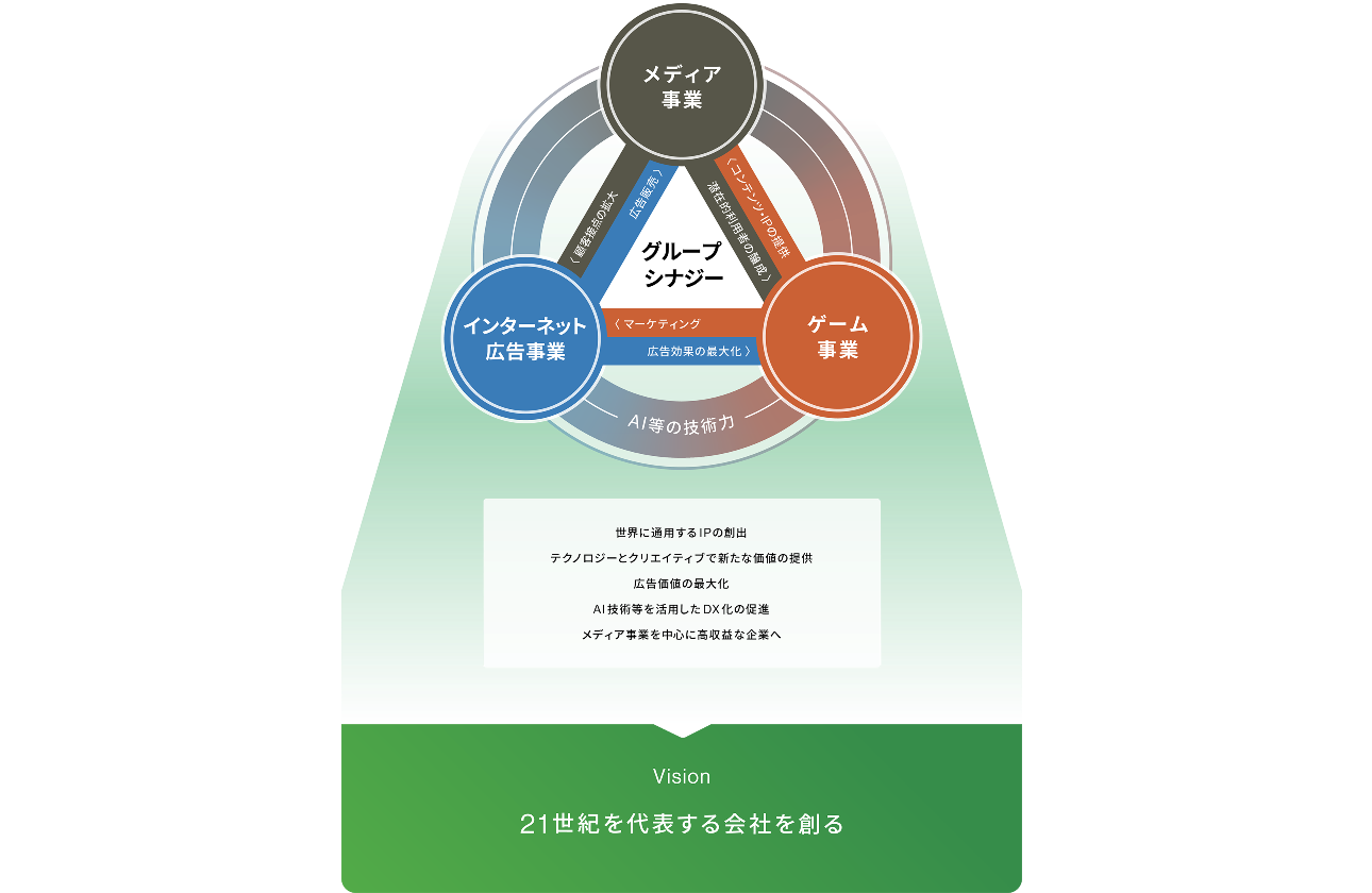 インターネット分野を成長産業と捉え、様々な事業の創出、技術力の向上等へ先行投資を行いながら、現在はメディア&IP事業、広告事業、ゲーム事業の主力3事業を中心に事業を展開し、2016年4月に開局した新しい未来のテレビ「ABEMA」を社会的影響力のあるメディア&IPにすることで、更なるグループシナジーの強化を図っています。