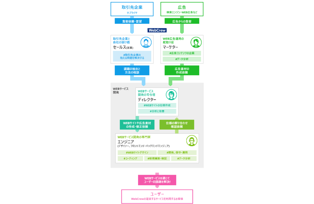 ウェブクルーは、事業会社であると同時におおむね内製でサービスの企画~制作・開発~改善・運用まで行っています。