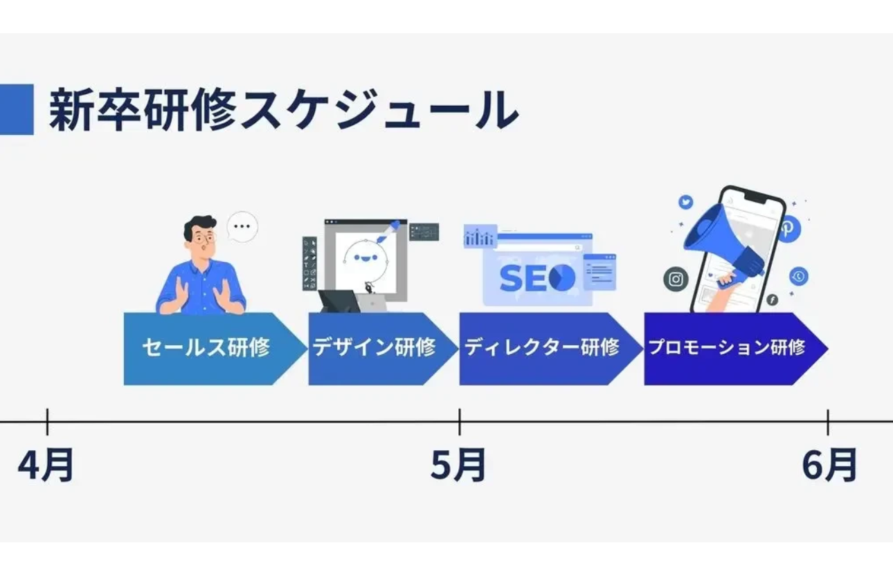 入社直後に何を学び得るかは、社会人としてウェブクルーの社員としてスタートを切る新卒の皆さんにとって大事な一歩だと考えているため、大きく成長していただくために充実した研修内容をご用意しています!