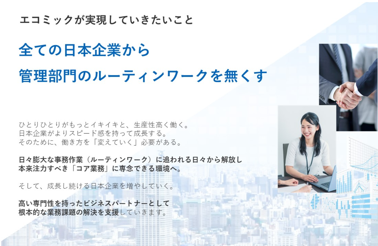 日本で初めて、給与計算BPO専業の企業として上場を果たし、中国でのオフショア拠点の設立、クラウドサービスとアウトソーシングを掛け合わせた画期的なサービスの提供など、エコミックは常に業界をリードしてきました。