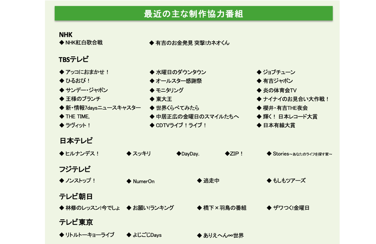 そんな人と人を繋ぐ、生きたモノづくりをしている当社では、芸能界の様々な分野に精通しています。