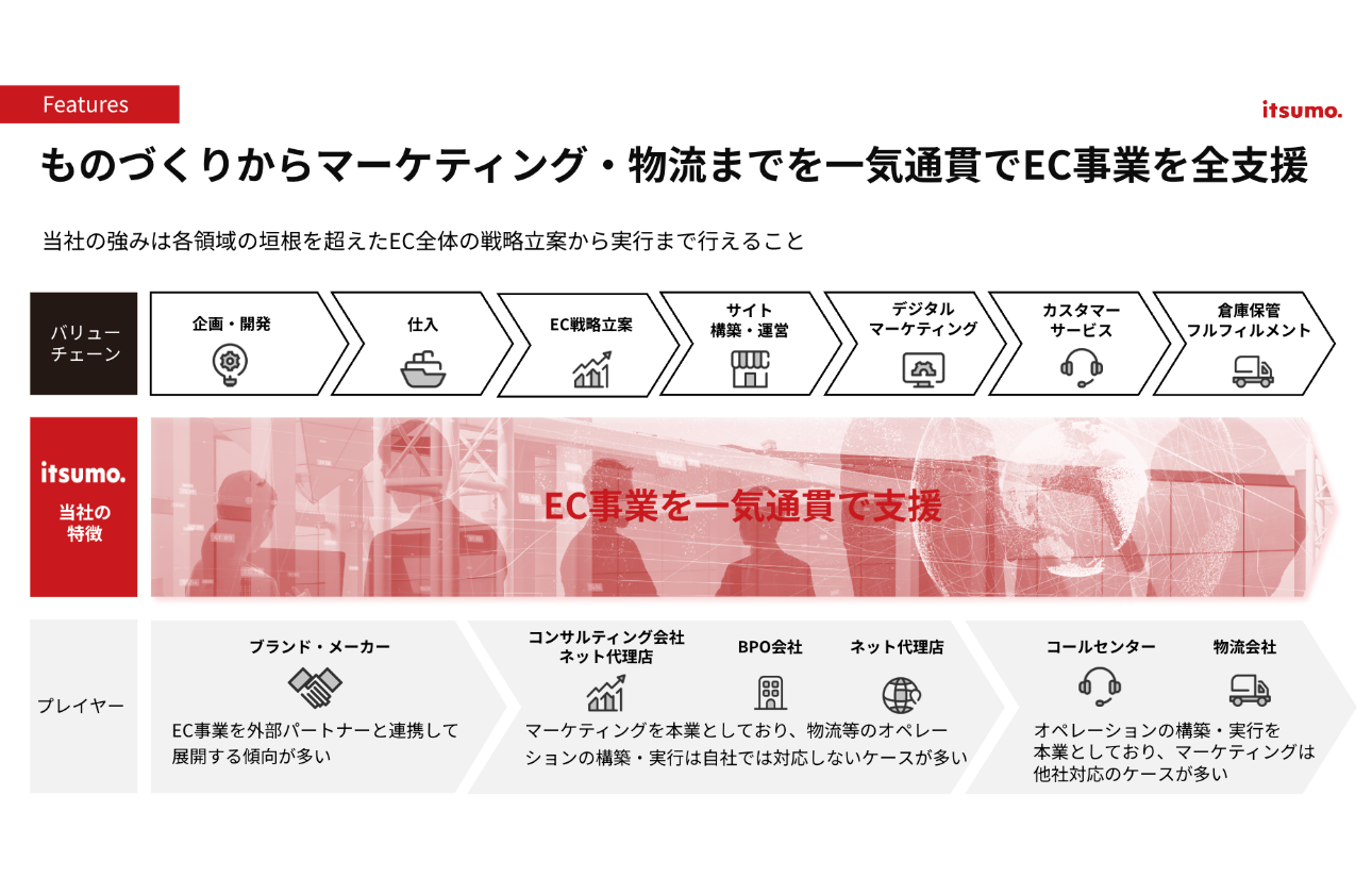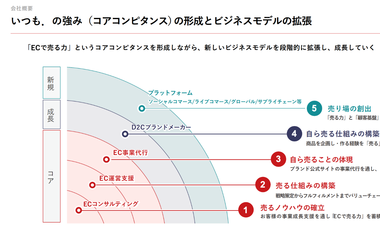 「ECで売る力」というコアコンピタンスを形成しながら、新しいビジネスモデルを段階的に拡張し、成長していくのが弊社の事業戦略となっております。