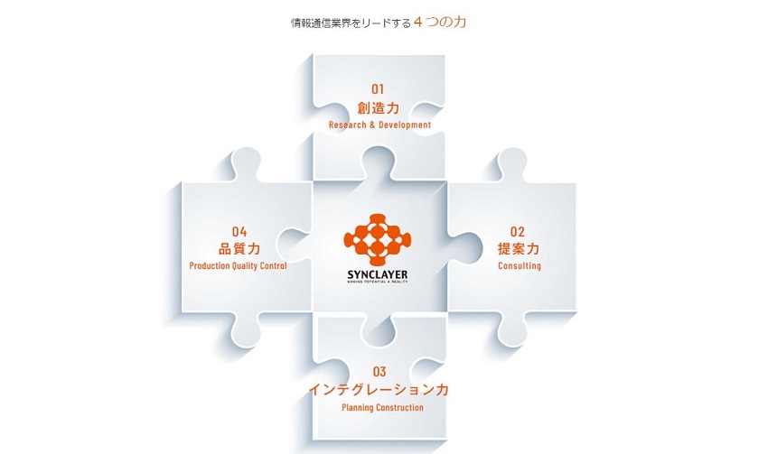 新たなネットワークを支えるため、斬新なシステムと機器を自社開発できるだけでなく、国内外を問わず多くのベンダーと連携し、包括的にシステム・インテグレーションできる企業、それがシンクレイヤです。