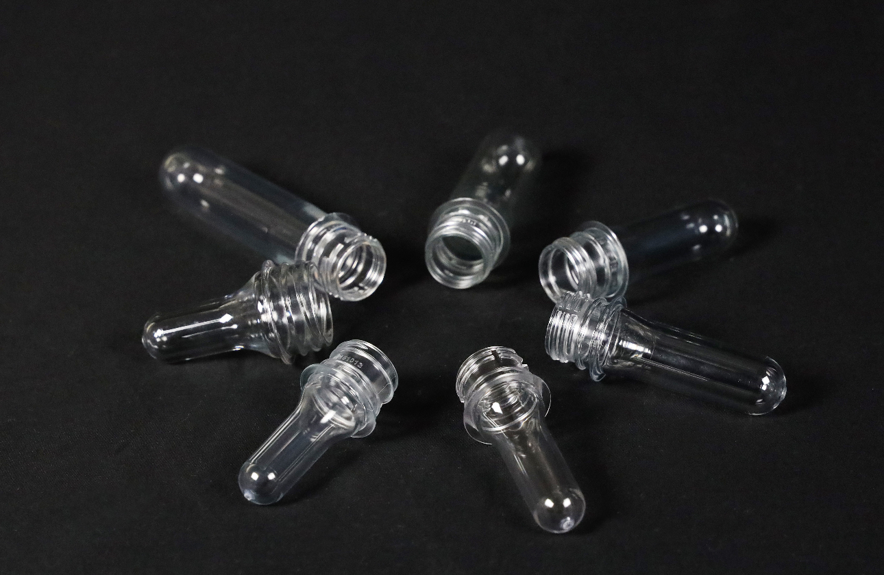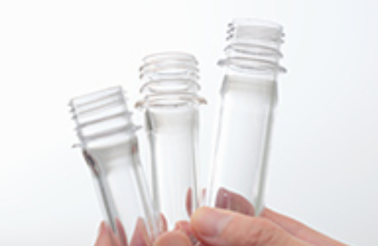 当社はPETボトルの中間製品である『プリフォーム』の設計・開発・製造を行っています。プリフォームと聞いてもあまり馴染みがないかもしれませんが、店頭に並んでいるPETボトルの多くは、プリフォームからできています。当社はプリフォーム業界においてシェアトップを維持し、大手清涼飲料メーカー様の多くの主力製品に当社のプリフォームを使用いただいています。近年ではプラスチック使用量の削減を目指し、リサイクル原料でできたボトルや簡単に折りたためる軽量なボトルを開発するなど、「環境に優しいPETボトル」の研究・開発により地球環境問題解決へ貢献しています。