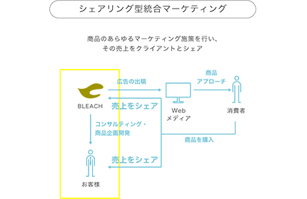 ブリーチがマーケティング費用を負担し、マーケティングの上流から下流まで(クライアント企業の商品企画から顧客が購入に至るまでの全工程)を担い、成果に応じて売上をシェアしてもらうのです