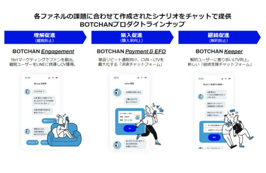 これまで、Q&A型のチャットボットを扱う企業は多数ありましたが、消費者の新規獲得から解約防止までを一気通貫に支援することを目的としたプロダクトを提供しているのは弊社しかありません。