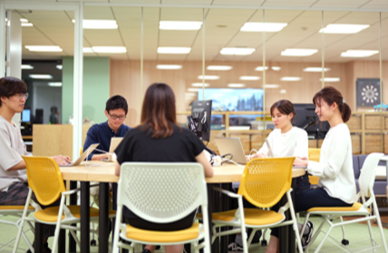 円卓でチームや先輩たちと会話をしながら仕事が進めやすいエリアです。