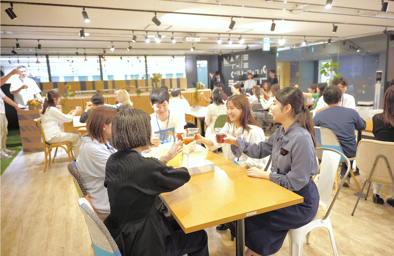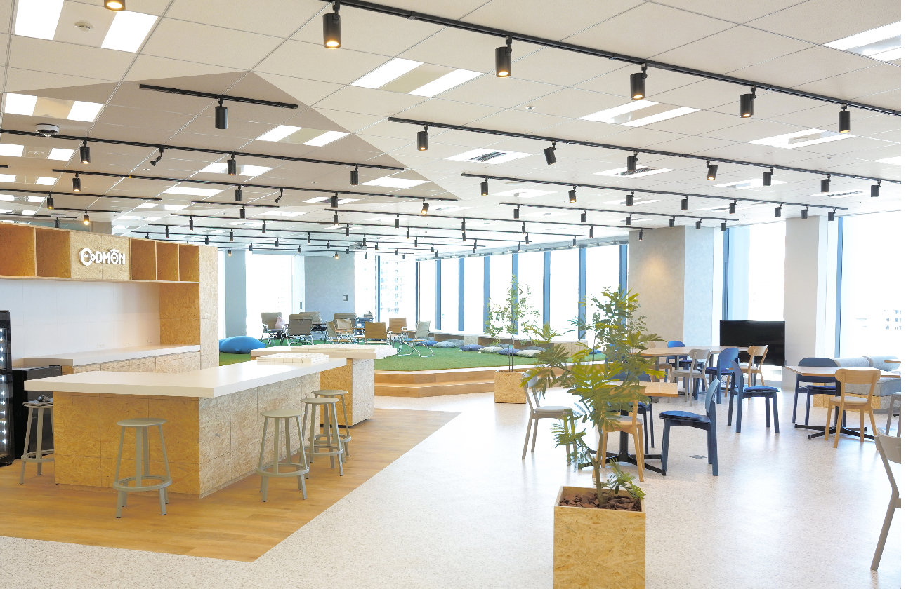 ランチコミュニケーションを取ったり、社内イベントを実施する際に使っている場所で、芝生エリアにはくつろぐスペースも併設されています。