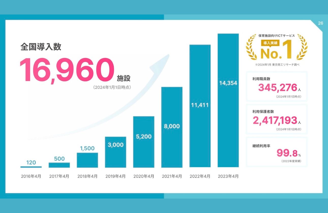 メインサービスの「コドモン」は、全国の保育所の25%で導入され、実質的に業界標準システムとなっています。