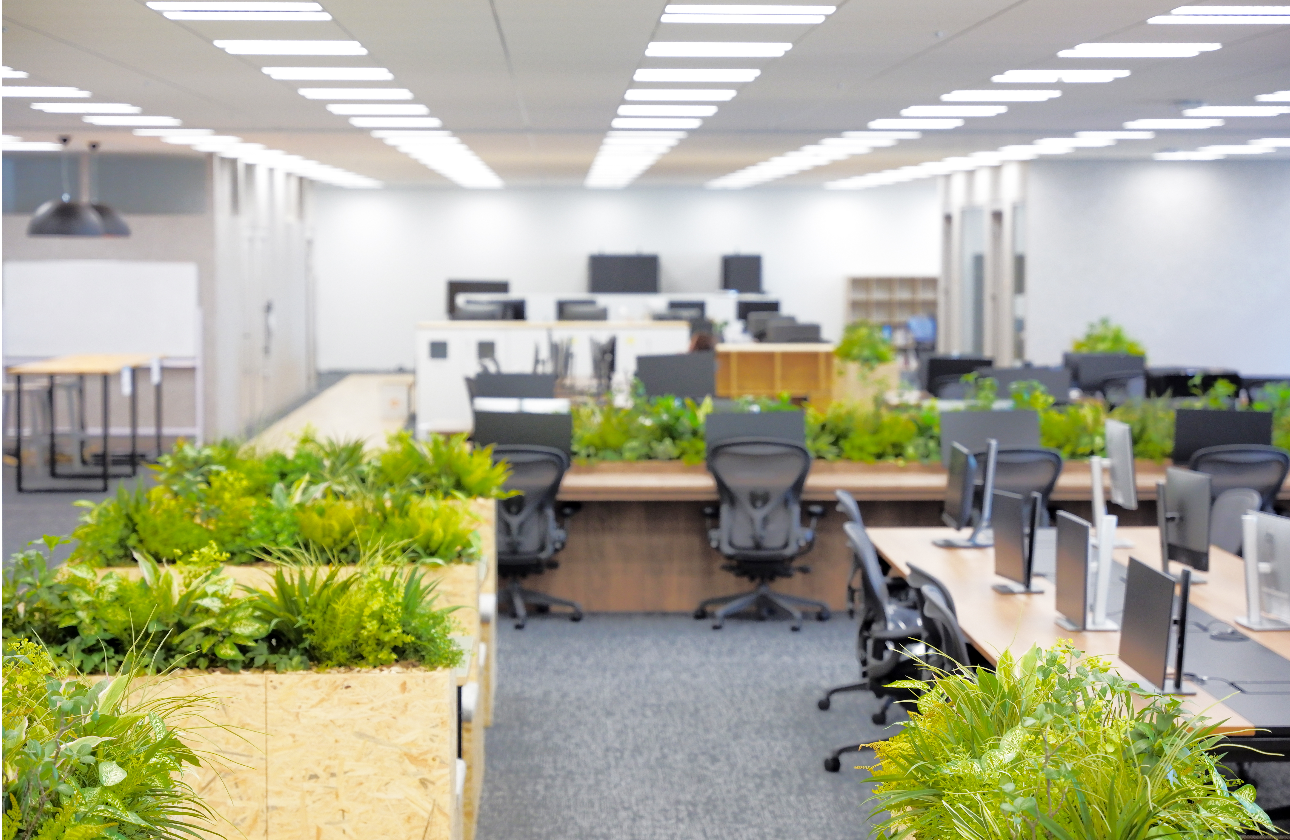 社員が業務を行うメインルームです。「仕切り」が存在せず、フラットでオープンなコミュニケーションがとれるよう設計しています。