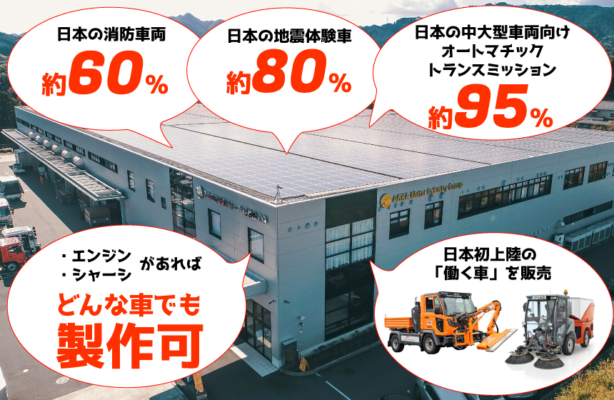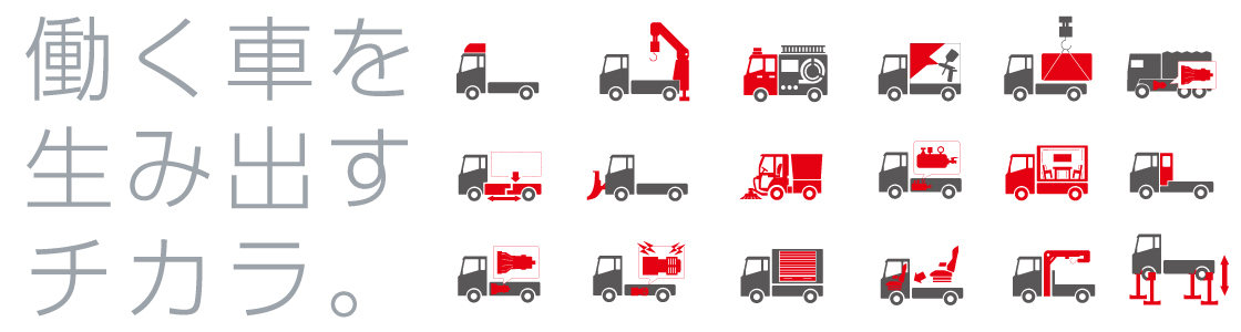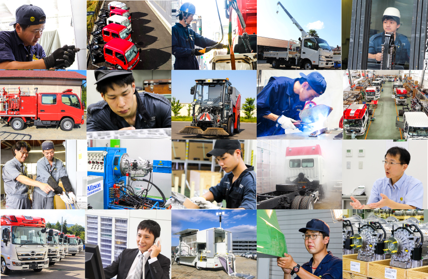 「技術を繋ぐ、人を繋ぐ」をテーマに、グループ5社の力を結集し、トラック・バスや消防車両などの「働く車」を中心に、設計・製造から自社製品ならびに輸入品の開発・販売を幅広く手掛けています。