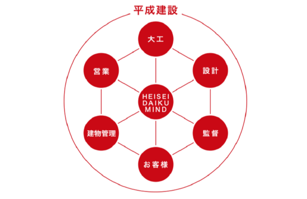 平成建設は200名を超える大工集団を育てる、大変珍しい建設会社です。当社の使命は、単に建物を建てることではありません。職人を大規模に育成し、彼らが誇りを持って働ける環境を提供することで、日本の伝統的な技術を絶やさず、未来の豊かな建築を担っていくことにあります。お客様に質の高い建築を提供するだけでなく、次の世代へと匠の技を伝える、伝統技能の継承者集団でもあります。一般的な建設会社では、営業、設計、施工管理、そして現場の職人は、それぞれ別の会社に所属しているのが当たり前です。しかし平成建設では、建築に関わる全てのプロフェッショナルが、同じ会社の正社員。それぞれの専門家が持つ知識と経験、そしてお客様への想いを、一つのチームとして結集させる。設計も、施工も、職人の技も、すべてが社内にあるからこそ、一切の妥協なく、お客様の夢を最高の形で実現できるのです。平成建設では、設計も、施工も、営業も、全員が「職人」として誇りを持ち、本物を追求する環境です。10年後も色褪せない「本物の市場価値」を、自分の手で、誰よりも早く、私たちと一緒に掴み取りませんか?