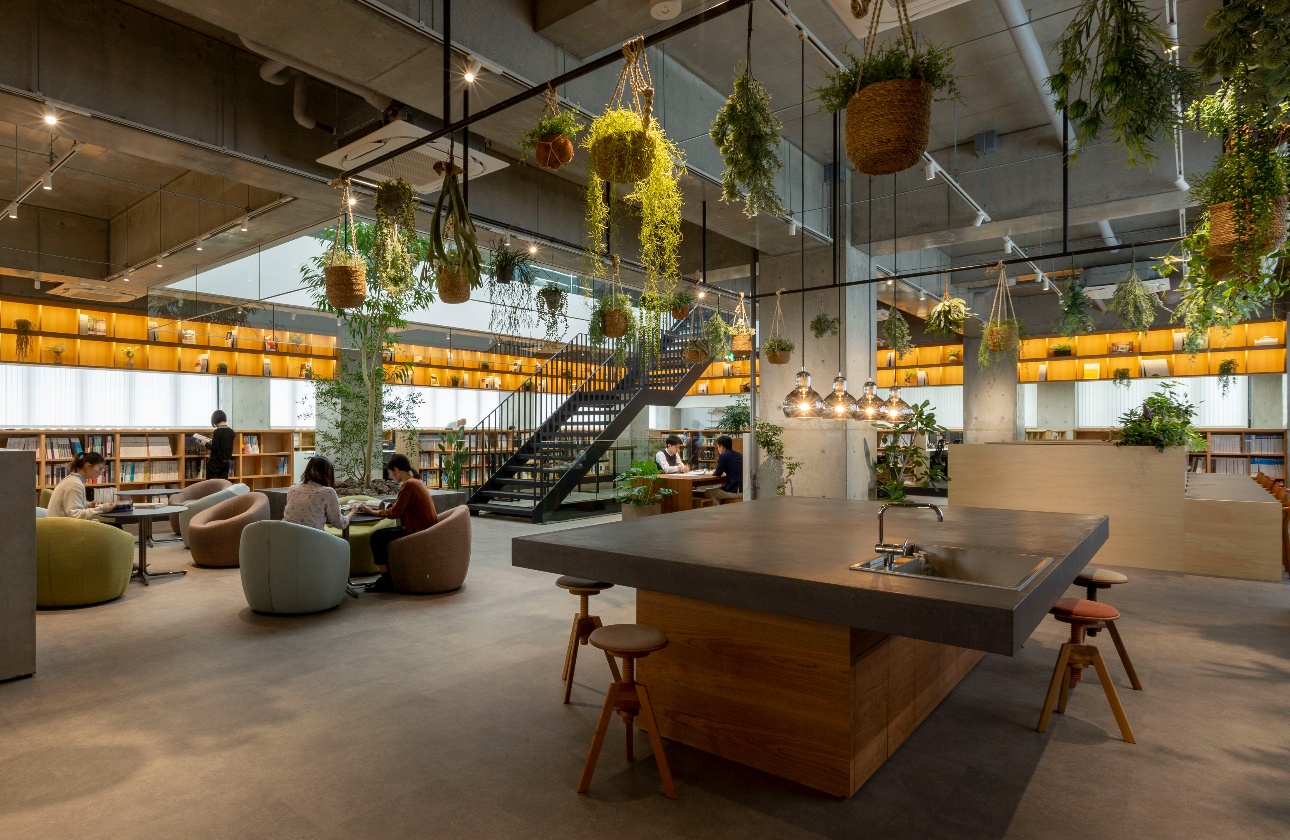 平成建設の本社のラウンジの様子です。豊かな共有スペースは社員の交流を促し、内製化システムの本領が発揮されます。