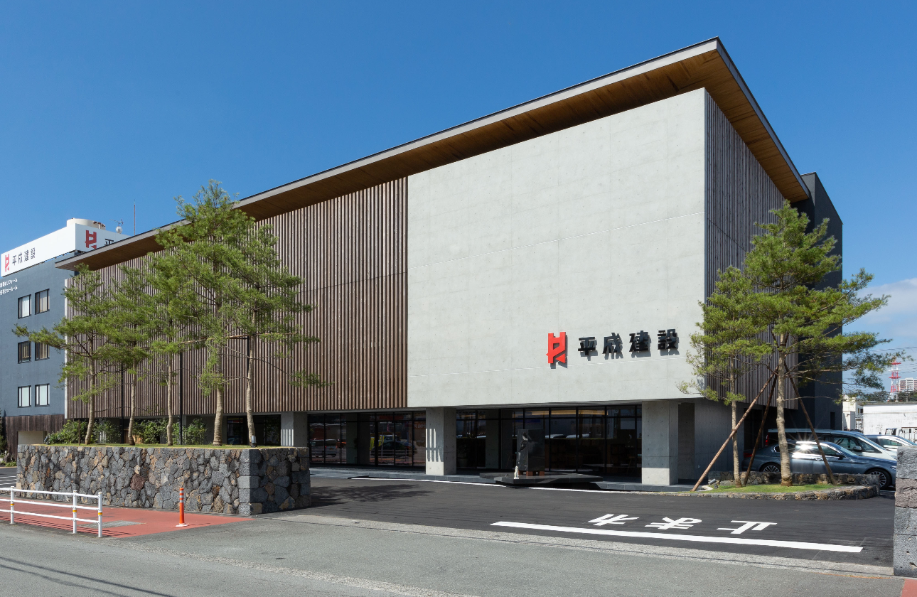 静岡県沼津市に位置する平成建設の本社です。ファサードの木のルーバーは大工を、コンクリート打放は工務を象徴しています。