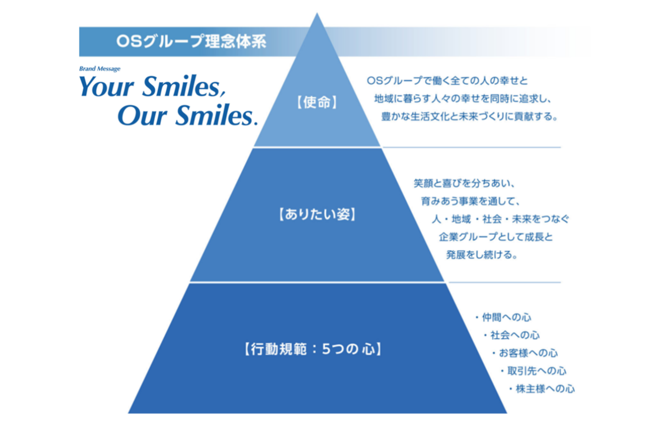 当社グループは理念体系に掲げる「OSグループで働く全ての人の幸せと地域に暮らす人々の幸せを同時に追求し、豊かな生活文化と未来づくりに貢献する。」という使命の実現に向け、不動産事業及びエンタメ・サービス事業を通じてお客様へよろこびの「時間」と「空間」を提供し、持続的な成長と企業価値向上を目指してまいります。