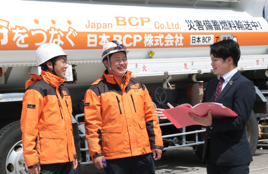 「BCPって、なに?」と思われた学生の方も多いと思います。BCPとはBusiness Continue Plan。事業継続計画という意味です。私たちが活躍するのは災害が発生した後。地震や大規模停電の発生時において、通信会社、放送局、病院や施設などの自家発電システムの動力となる軽油や重油を速やかに配送。設備の正常稼動を支えます。