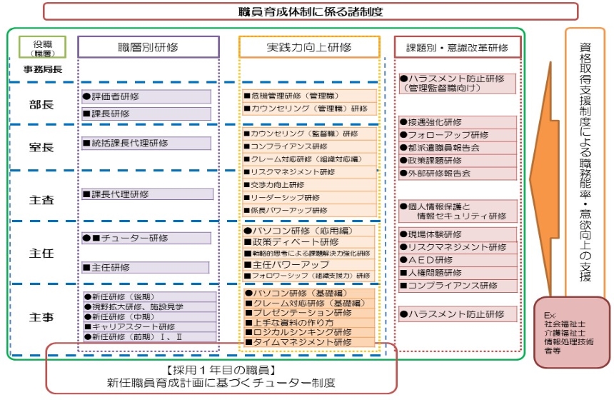 教育制度:チューター制度、職層別研修、実践力向上研修、課題別・意識改革研修、資格取得支援制度