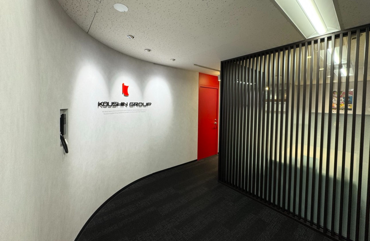 コーポレートカラーである赤を基調とした曲線デザインのエントランス。創業時の画廊経営に由来するこの赤色は、庚伸のアイデンティティそのものです。