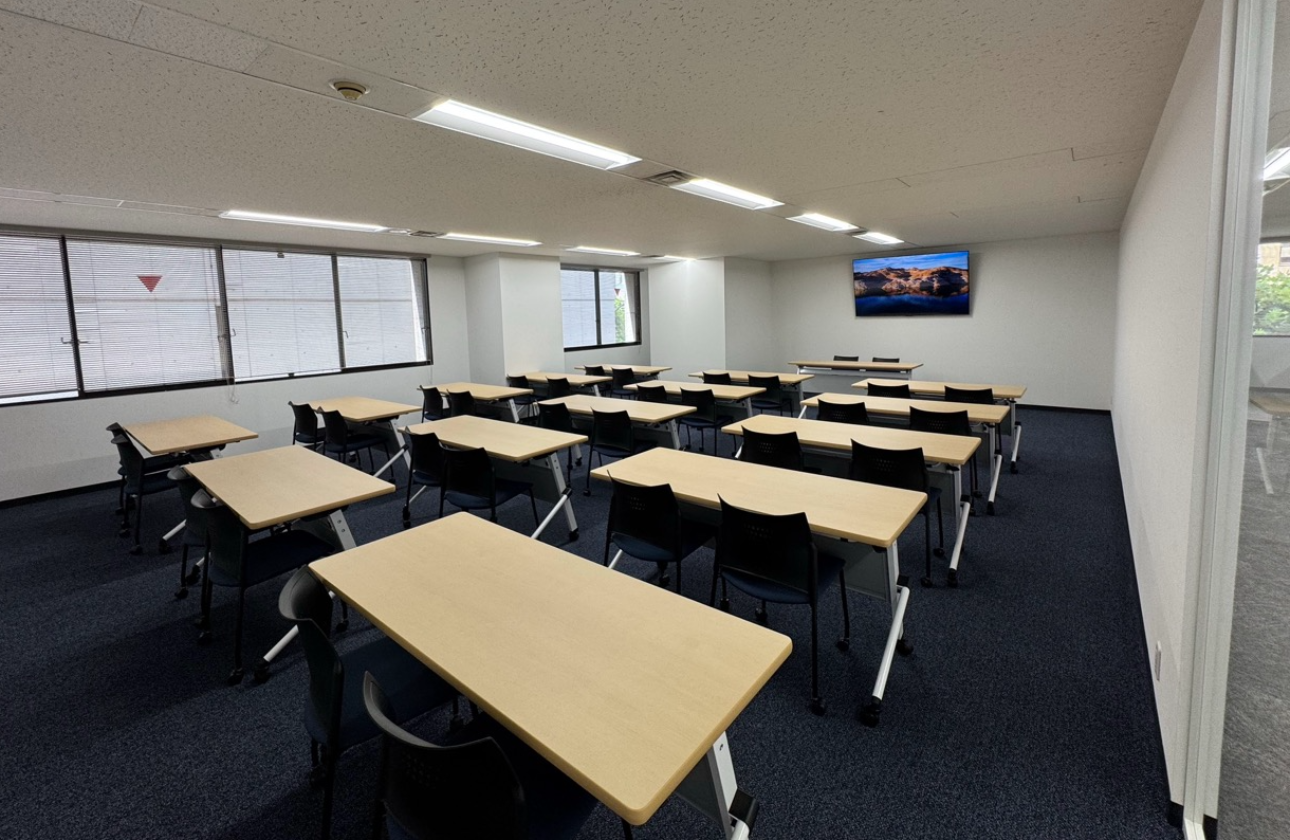セミナー形式のレイアウトで、研修や勉強会などの場で活用されています。テーブルをコの字型に配置し、360度カメラで拠点間を繋いだ会議も実施。
