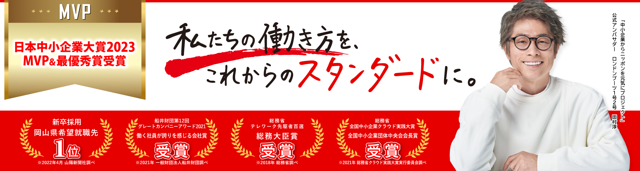 私たちは岡山から【働くに笑顔を】という理念のもと、中小企業の働き方を変え生産性を向上するサポートをしており、具体的にはDX支援、働く環境改善支援、人材育成採用支援の3つで、中小企業の働き方を支援しています。