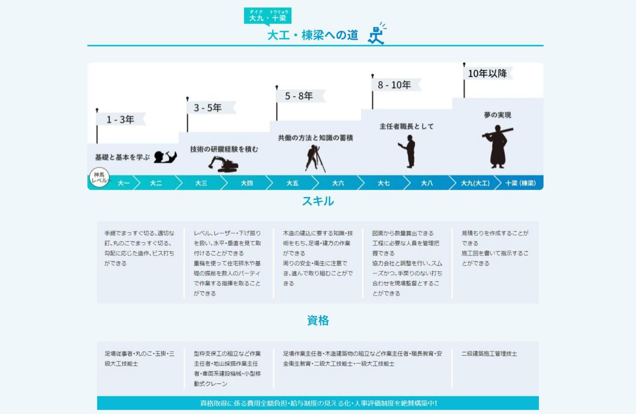 大工を含めて専門部分に携わる人材です。最終的には自らが資格を取り、神馬建設だけでなく地域社会にも技術を伝承していくことを目指していきます。