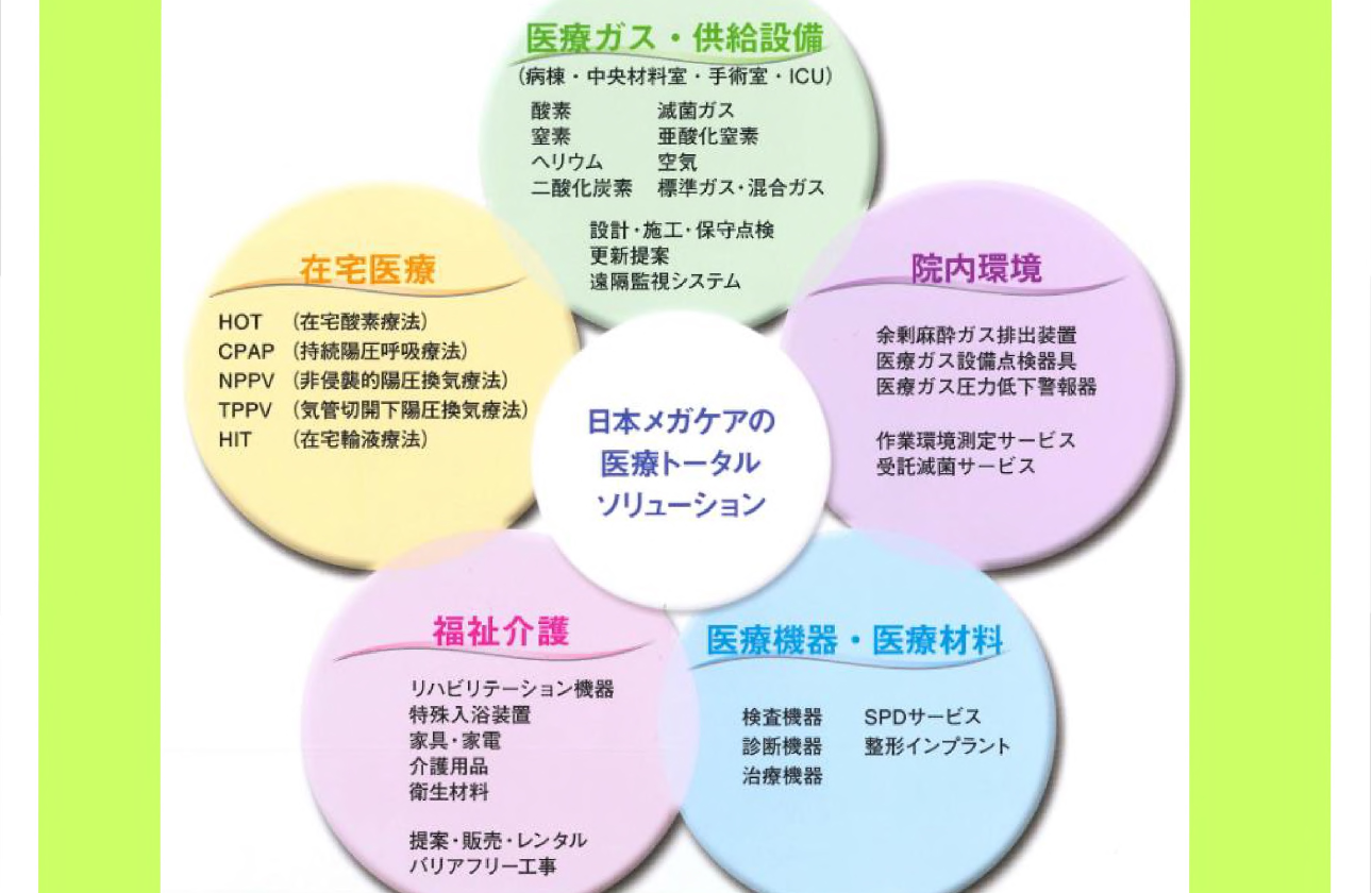 005年10月に産業ガス大手の大陽日酸を核に、関東を地盤とする医療ガスディーラー3社が合併し、日本メガケアが誕生しました。さらに、2011年10月には医療機器・医療材料・福祉介護関連商品を扱う企業と合併し、医療の現場では欠かすことのできない医療ガス、医療機器、今後さらに拡がっていく在宅医療を基盤に福祉介護の分野でも事業を拡大しております。